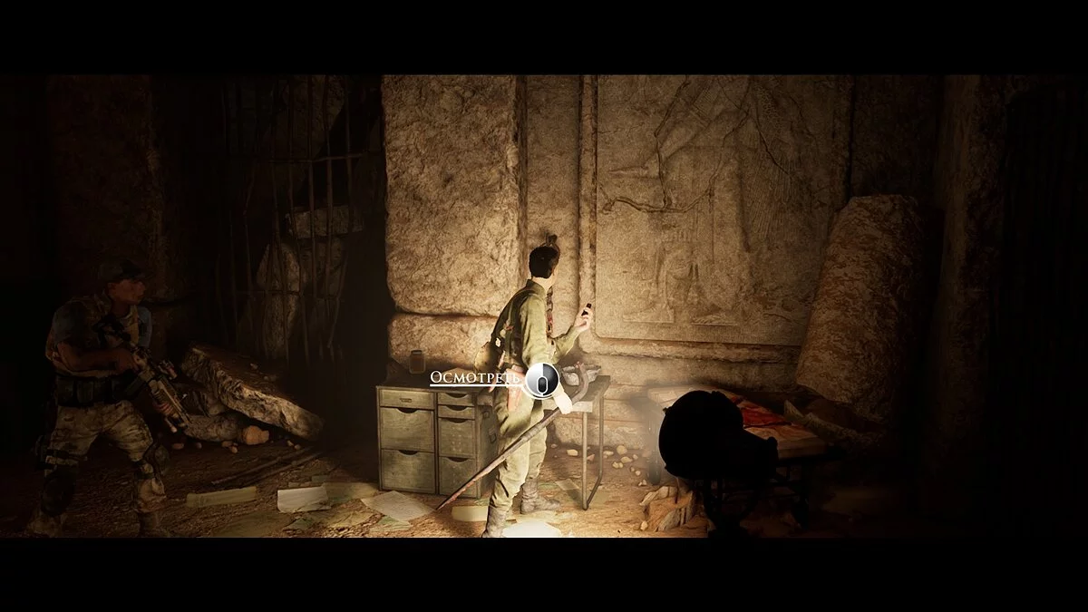 Возвращаемся обратно и двигаемся в левый проход. Спускаемся по лестнице ещё ниже. Перебравшись в другое помещение осматриваем фигурку на земле и открываем секрет №18 «Пазузу». Она расположена слева от разбитой таблички с рисунками. Двигаемся вперёд и наблюдаем за спуском героев.