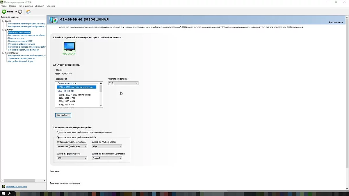 Выставьте максимально возможную частоту обновления дисплея. Некоторые дисплеи могут не поддерживает частоту более 60 Гц при максимальном разрешении, в таком случае стоит опуститься до 1080p. Например, именно так работают консоли PlayStation 5 и Xbox Series X с телевизорами, у которых есть только вход HDMI 2.0. В совместимых играх таким образом можно выставить режим 120 Гц. Кроме того, некоторые мониторы могут работать при повышенной частоте, даже если она официально не поддерживается. К примеру, монитор BenQ GW 2470 может работать при 75 Гц, если выставить кастомный режим изображения в драйверах видеокарты.
