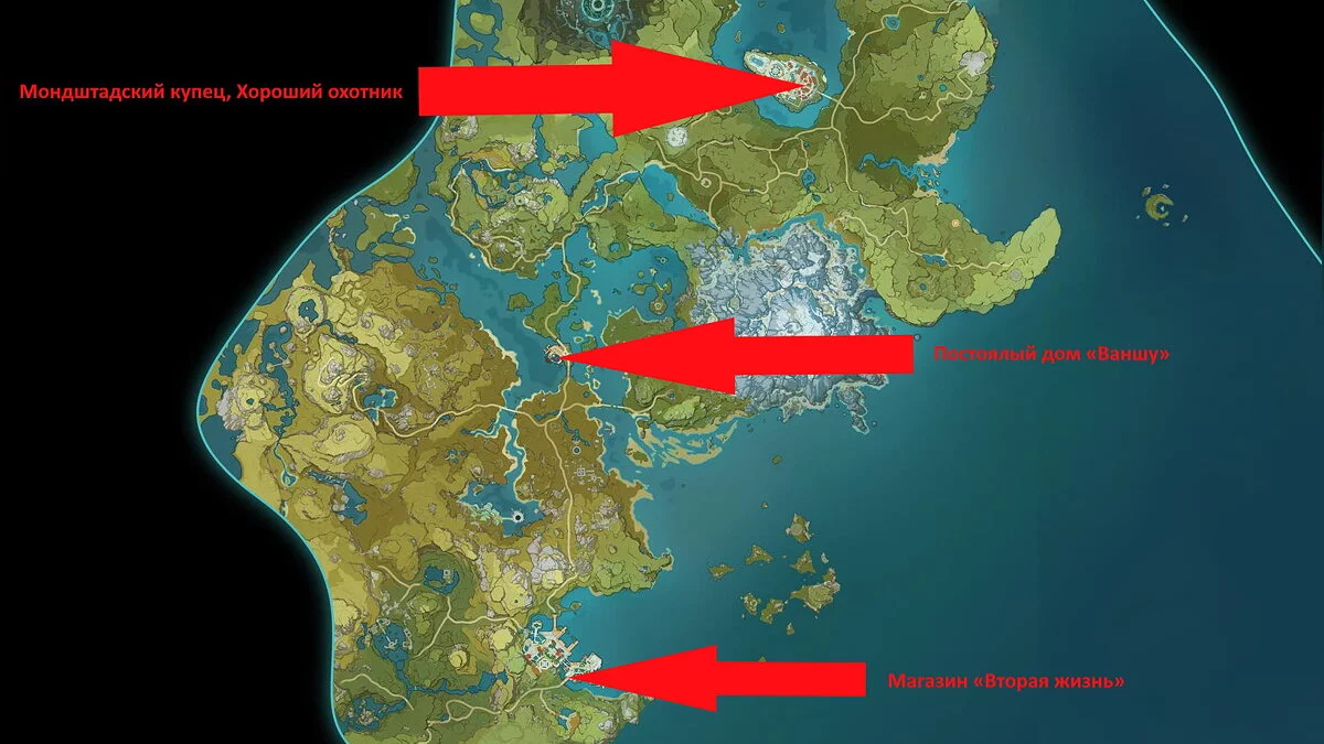 Молоко для приготовления масла и перец можно купить в магазинах «Мондштадтский купец» и «Вторая жизнь». Помимо этого, сливочное масло продаётся в ресторане «Хороший охотник» и постоялом дворе «Ваншу». Их местоположения мы указали на карте: