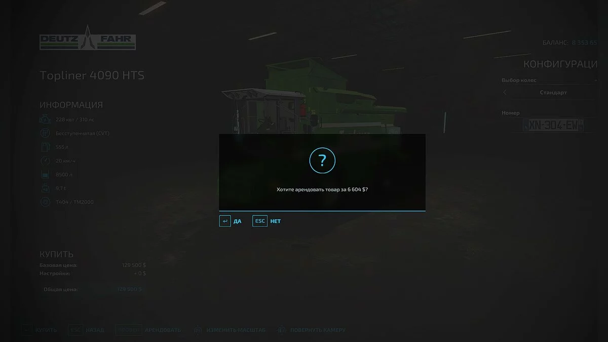 - Садитесь в комбайн, прикрепите жатку и разверните её. Для этого нажмите клавишу «B». Теперь опустите комбайн при помощи кнопки «V» и наймите работника нажатием на кнопку «H»;
