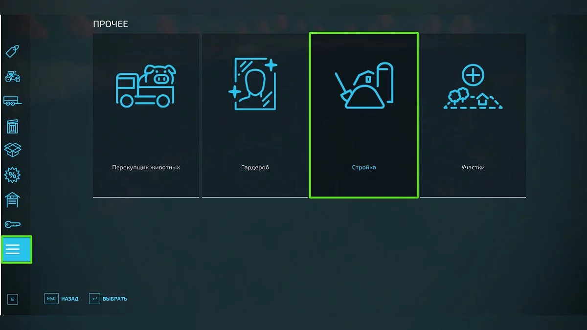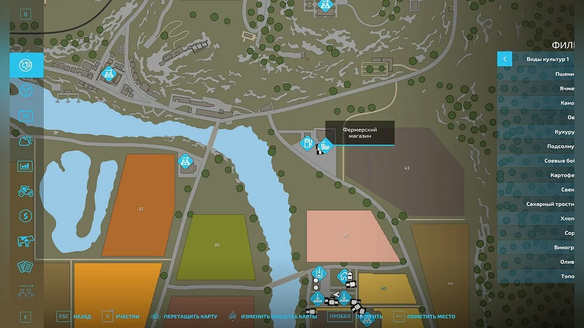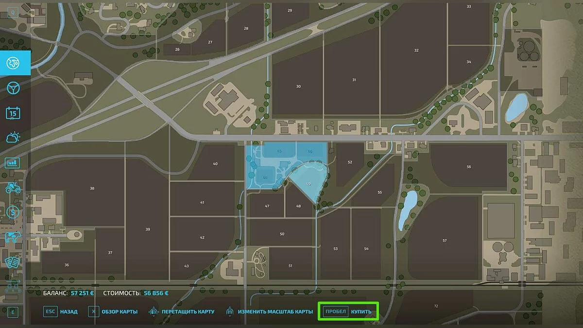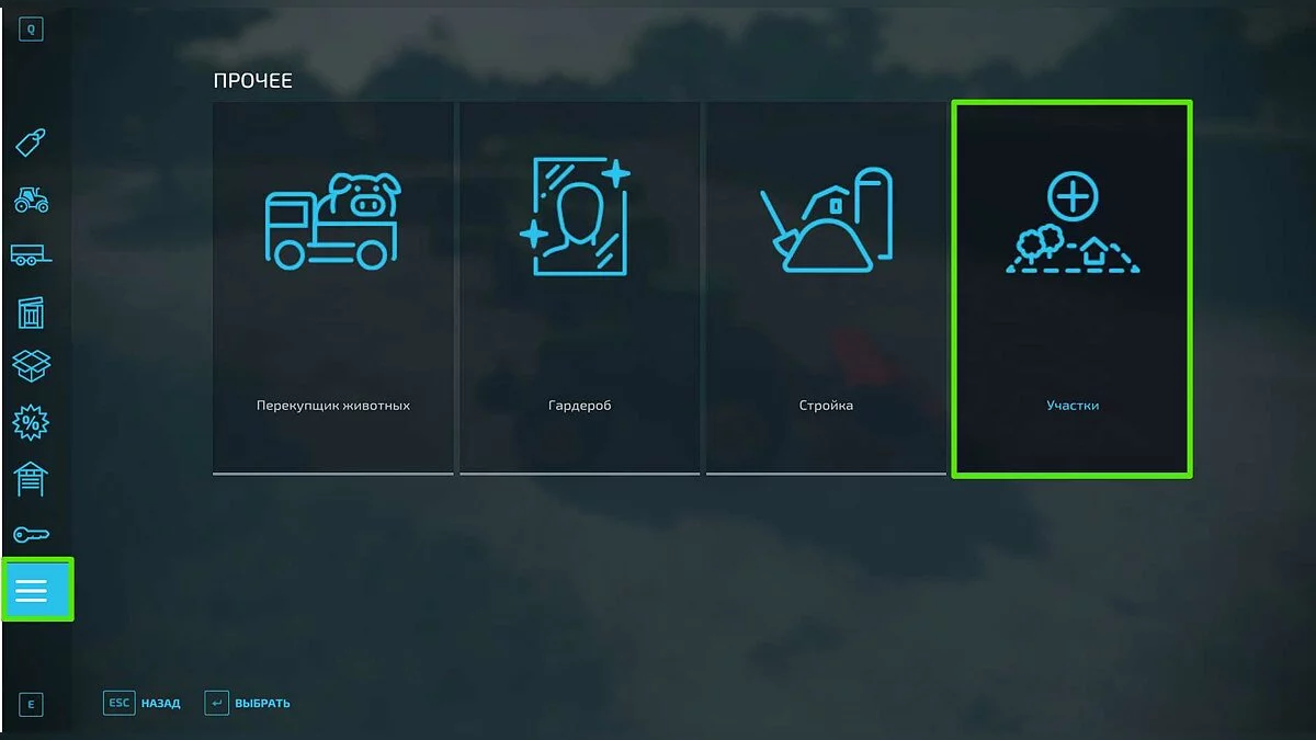 Все поля в игре можно приобретать или продавать другим фермерам. Чтобы купить участок, перейдите в меню магазина (клавиша «P»), откройте вкладку «Прочее» и нажмите на раздел «Участки».