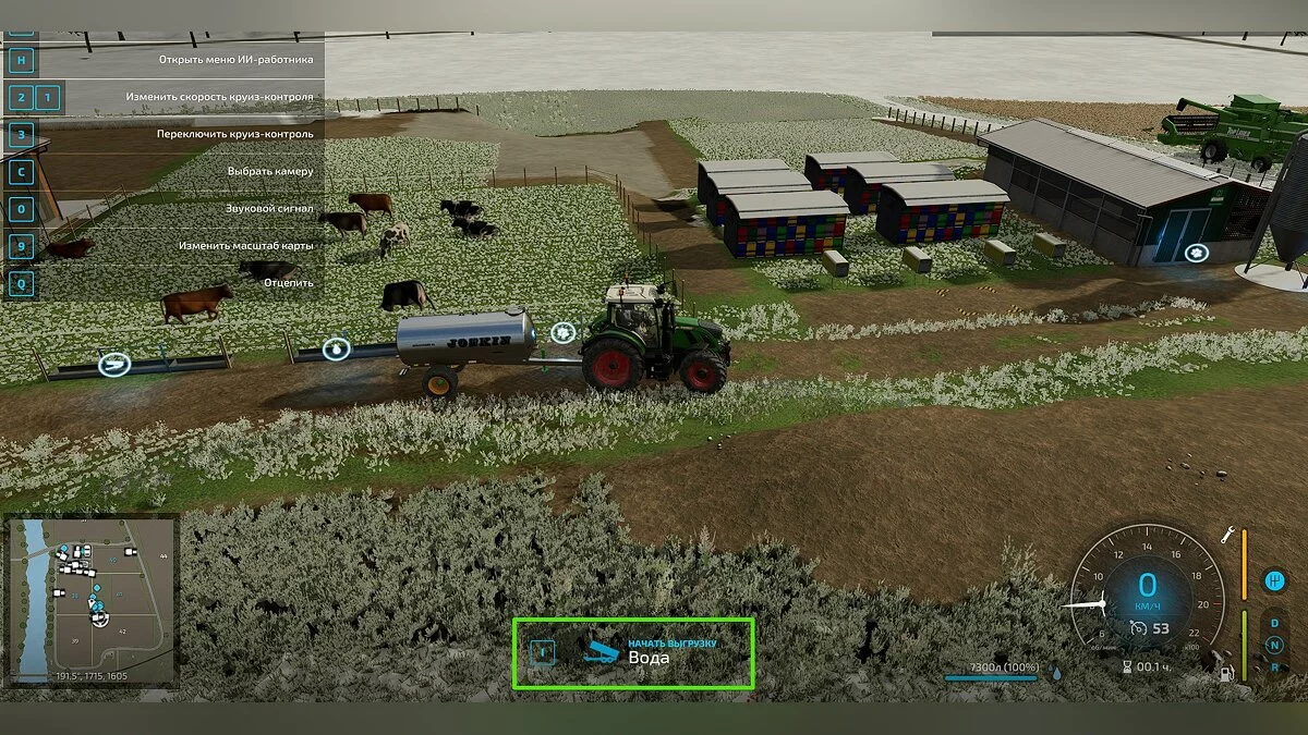 Если вы содержите животных на пастбище, то помимо корма вам понадобится поить животных водой. Воду можно покупать на водонапорных вышках, но это очень дорого. Чтобы сэкономить на воде, приобретите цистерну для воды (если вы содержите коров, то есть смысл сразу приобрести комбинированную цистерну, в которой вы сможете перевозить и молоко) и отправляйтесь к ближайшему водоёму. Подъедьте к водоёму задом так, чтобы колёса цистерны опустились в воду и наберите необходимое количество воды.