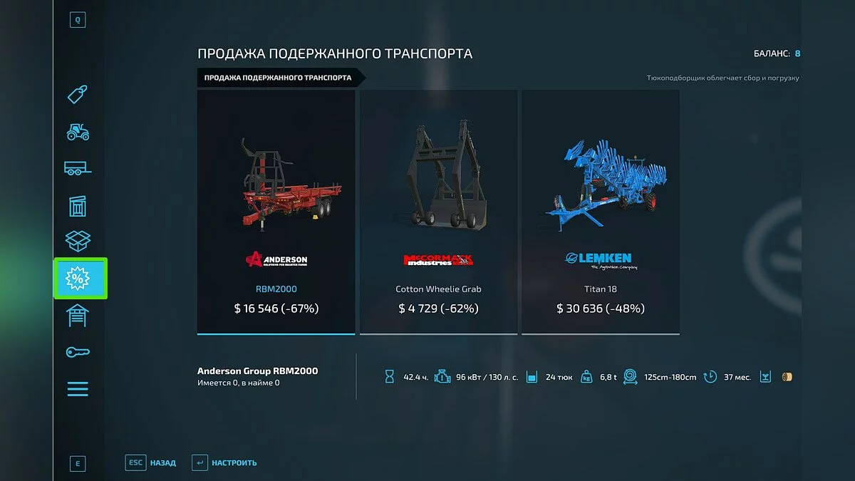 - Уборочные машины (комбайны): техника предназначена для сбора пшеницы, ячменя, канолы, овса, подсолнуха и кукурузы. Сам по себе комбайн не может работать без подходящей жатки (приспособление для сбора урожая). Существует более десяти видов жаток для различных культур. Например, одной и той же жаткой можно убирать урожай пшеницы и хлопка, а для сбора подсолнуха понадобится отдельная жатка. Чтобы отследить необходимые жатки или другие приспособления, которые могут быть использованы с выбранной техникой, достаточно выбрать меню «Сочетания» (клавиша «С»).