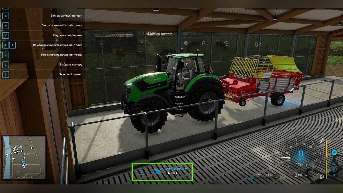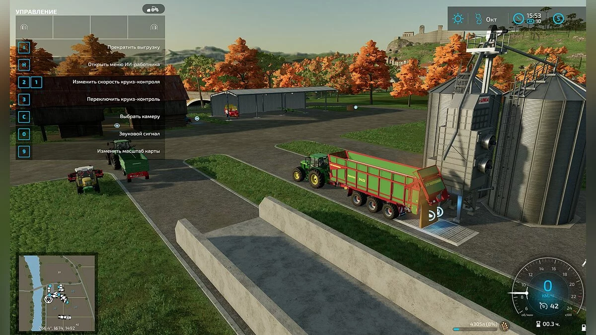 По мере сбора урожая комбайн заполняется собираемой культурой. Если для сбора урожая вы наняли работника и он прекратил работу из-за нехватки места в хранилище, садитесь в трактор, зацепите им грузовой прицеп и подъедьте вплотную к комбайну. Чтобы начать выгрузку, вам предварительно следует открыть навес на грузовом прицепе (если такой имеется), нажав на клавишу «N».