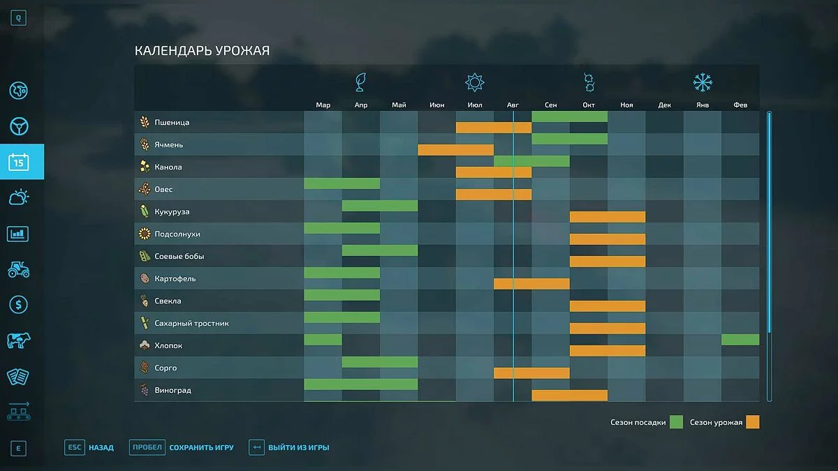Каждая отдельная культура может быть посажена только в определенный период. Откройте главное меню и перейдите в раздел «Календарь урожая». Здесь вы увидите перечень всех культур и график с сезонами посадки и урожая.