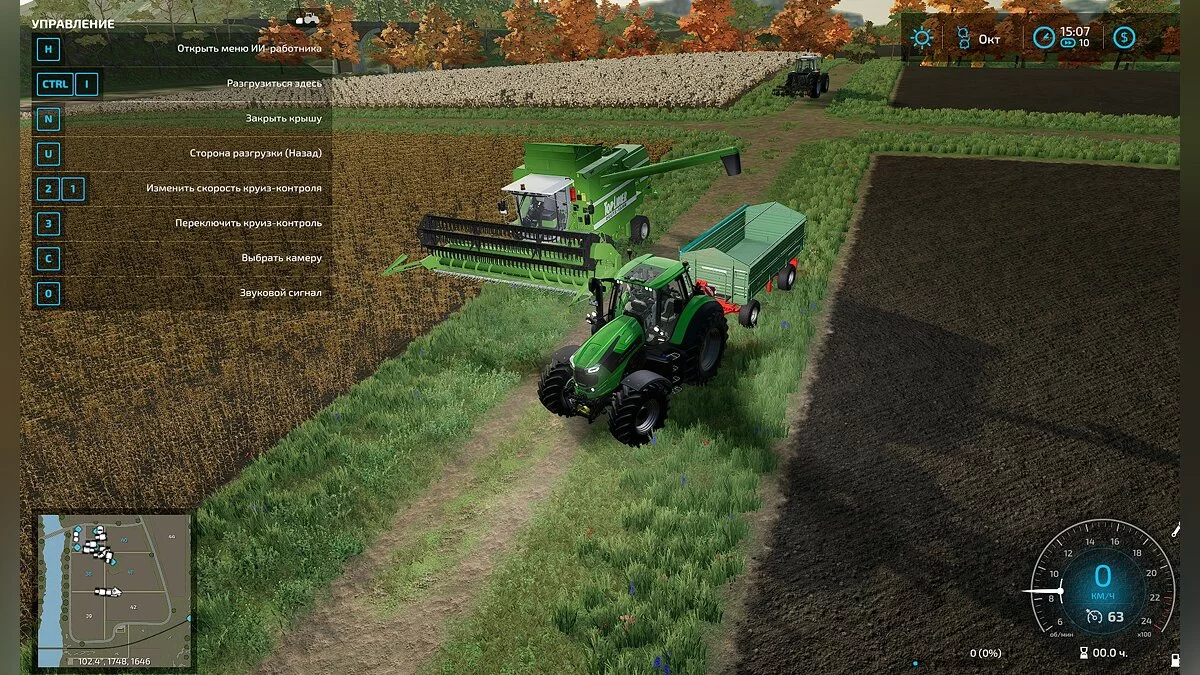 - Перейдите к трактору с грузовым прицепом. Прикрепите прицеп, подождите, пока комбайнёр закончит работу, затем подъедьте к комбайну слева и дождитесь разгрузки;