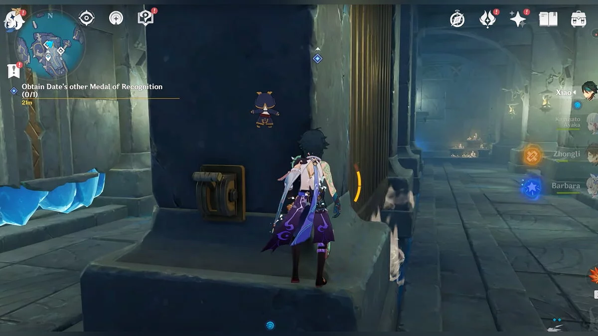 Бегите вперёд и преодолейте пропасть. Расправьтесь с врагами и поднимитесь наверх по колонне. Активируйте треугольный механизм при помощи атаки крио-персонажа. Стена сдвинется, а вы сможете собрать первый огонёк.