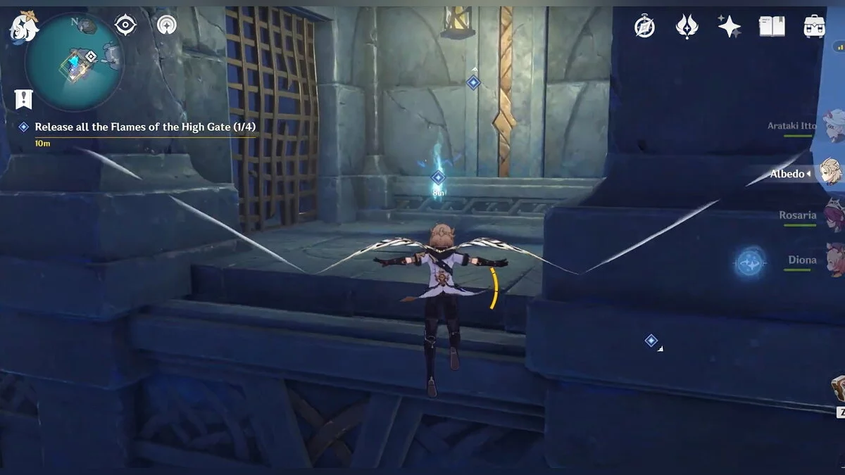 Вам необходимо спланировать вниз и зажечь три факела. Для этого потребуется лучник, который владеет стихией огня (пиро) — Ёимия или Эмбер. Ориентируйтесь по нашим скриншотам.