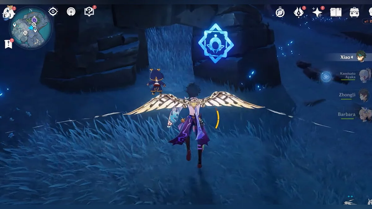 Для начала нужно активировать режим вечной ночи. Для этого используйте любой сферический механизм в Энканомии, затем перемещайтесь в отмеченную локацию. Найдите камень, подойдите к нему и выберите «Сесть», чтобы призвать духа.