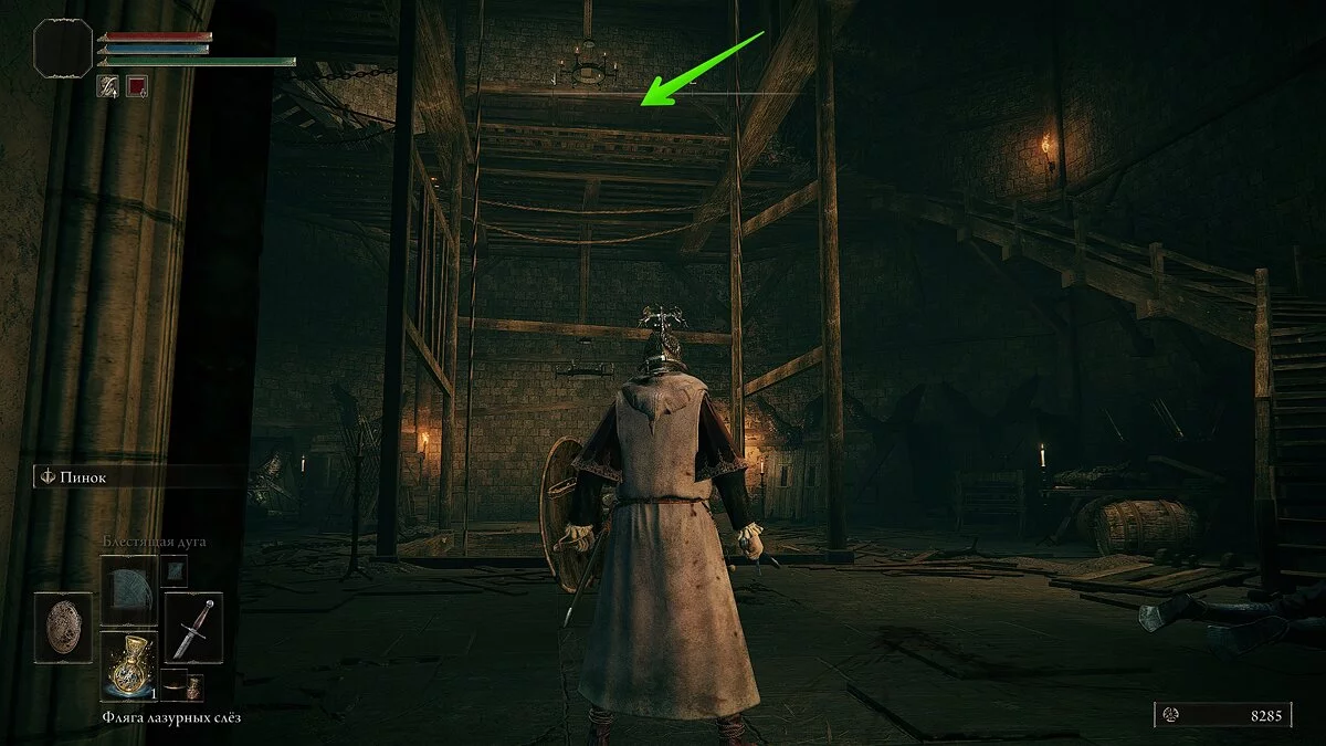 Спуститесь на этаж ниже, откройте найденным ключом запертую дверь и поднимитесь по лестнице наверх. Справа можно убить нескольких монстров и найти проход к башне. Если осмотрите это место, то найдёте каменный молот. Когда будете готовы, вернитесь обратно и поднимитесь по лестнице наверх. Найдите зал с лифтом, поднимитесь на второй этаж. В комнате слева взаимодействуйте с местом благодати.