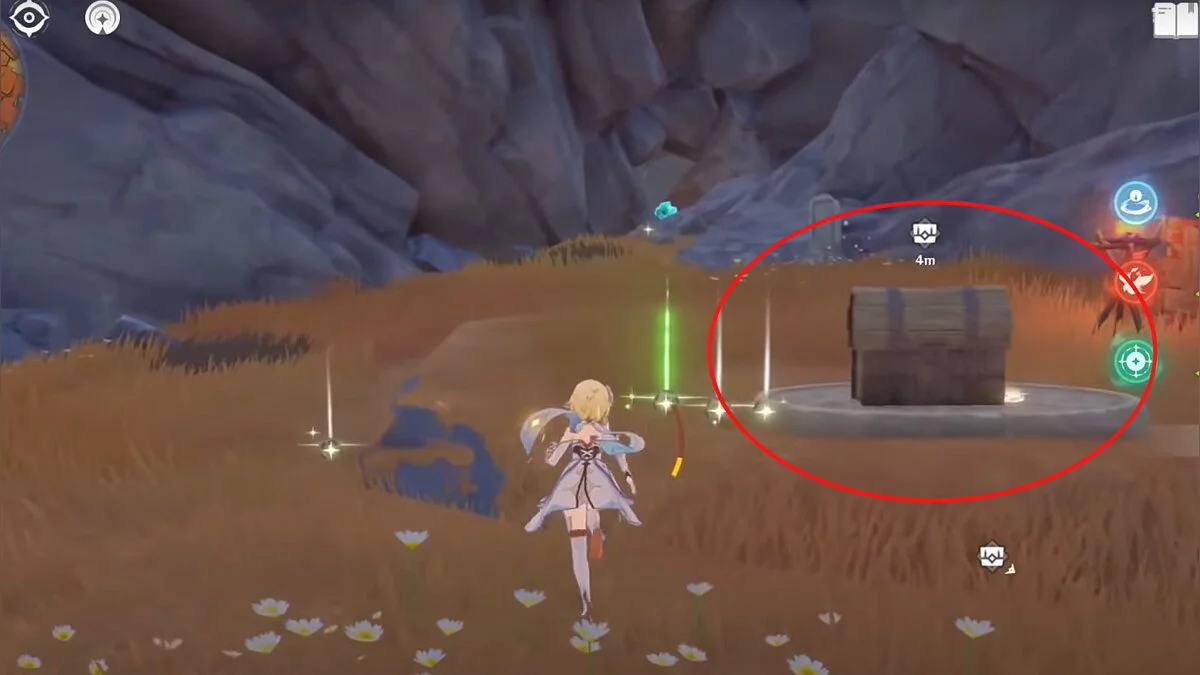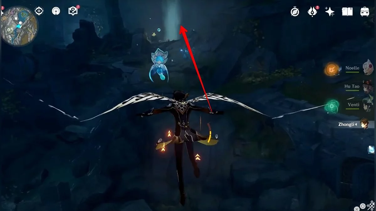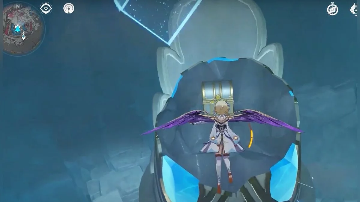 От телепорта двигайтесь направо, в сторону водопада. При помощи потока воздуха доберитесь до Анемо-монумента. Активируйте его и взлетайте наверх. Двигайтесь через воздушные кольца, чтобы подняться ещё выше. На вершине вы обнаружите роскошный сундук.