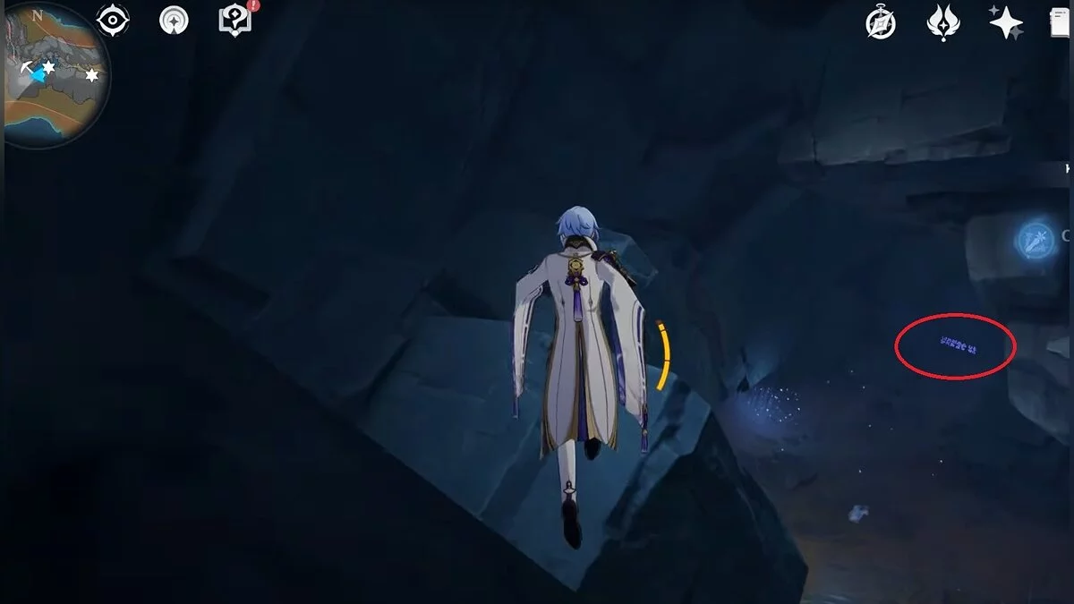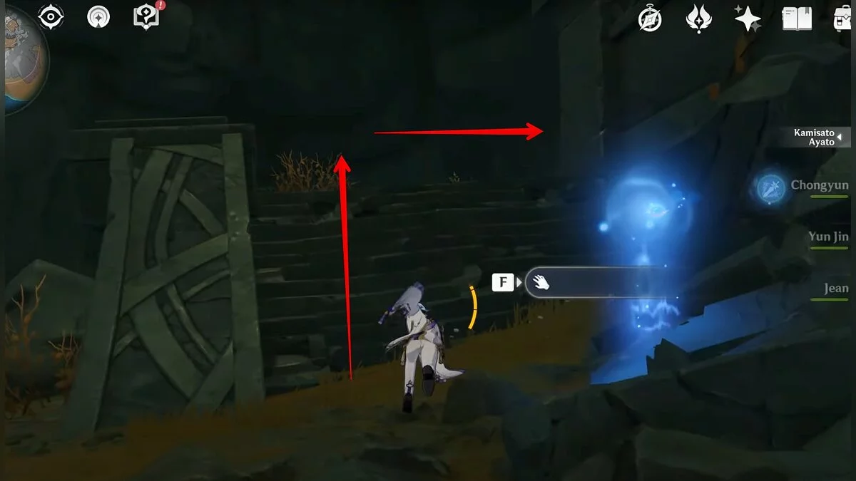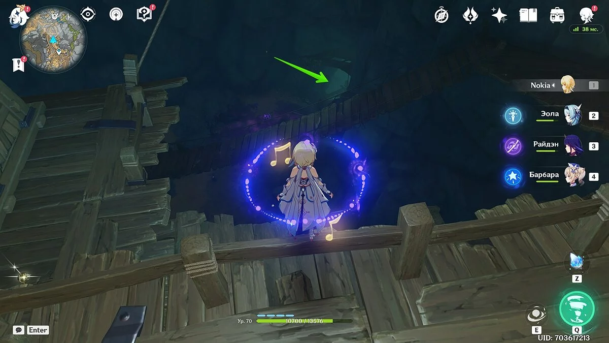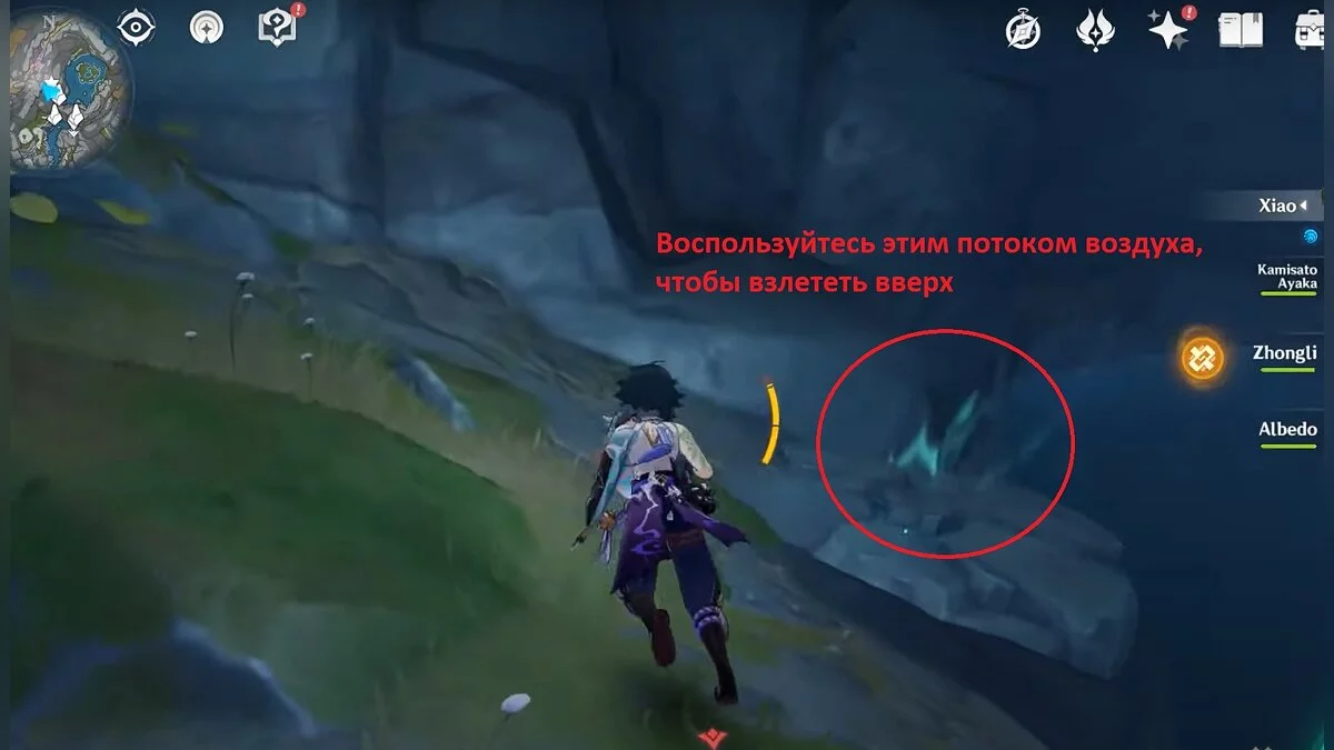 Когда окажетесь на месте, по мосткам поднимайтесь выше, а затем прыгайте и планируйте вниз. Пролетайте мимо фиолетового тумана, спускайтесь ещё ниже. Между сундуком и большой бочкой есть трещина в скале. Подойдите к ней и выберите вариант «Переместиться вверх». Вы окажетесь по другую сторону от той самой решётки и сможете открыть сундук.