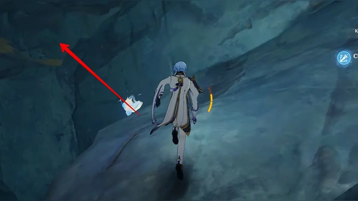 Бегите налево, мимо синих кристаллов и небольших водоёмов, пока не увидите пропасть. Прыгайте вниз.