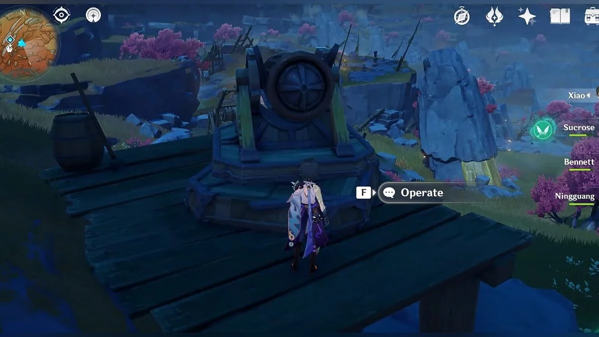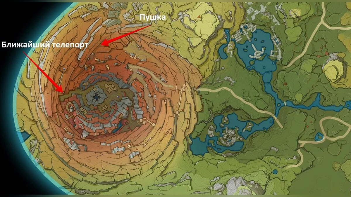Когда вы переместитесь к ближайшему телепорту, бегите на север, пока не попадёте в Ущелье Фуао. Вы увидите соответствующую надпись на экране. После этого вам нужно перелететь через ущелье. На другой стороне находится нужная пушка.