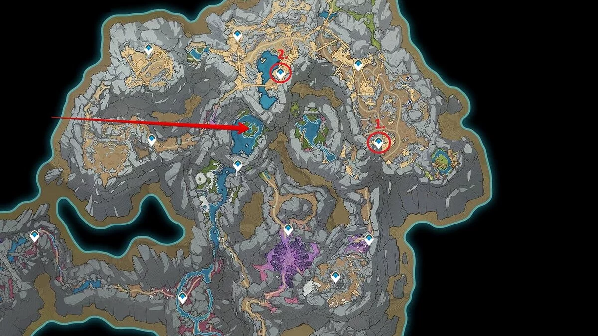 Отправляйтесь в точку, которая указана на карте. Если вы ещё не открыли срезку, воспользуйтесь телепортом на востоке (справа, он обозначен цифрой «1»). Если же вы взорвали стену при помощи бочек, можете воспользоваться точкой телепортации на севере (сверху, цифра «2» на карте).