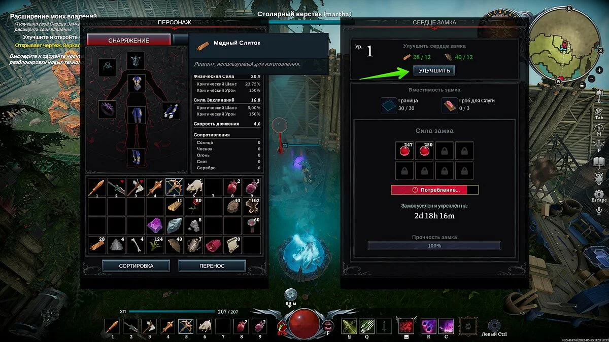 Когда выполните все условия и создадите достаточно кожи, добудьте медную руду и переплавьте её в печи, чтобы получить медные слитки. Всего для первого улучшения Сердца Замка потребуются следующие ресурсы: