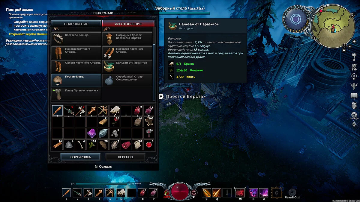 Практически в самом начале игры вы научитесь крафтить мазь от паразитов (Vermin Salve) — невероятно полезную вещь, которая восстанавливает 2,5% от максимального запаса здоровья каждые 1,5 секунды в течение 15 секунд. Нажмите Tab, чтобы открыть соответствующее меню. Обратите внимание, что действие мгновенно сбрасывается, если вы получите урон.
