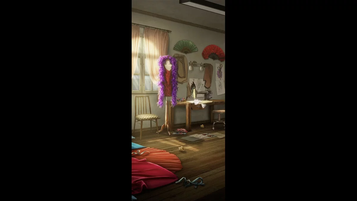 Девушка заходит в комнату к костюмеру. Он сидит за швейной машинкой и нетерпеливо машет на стул.