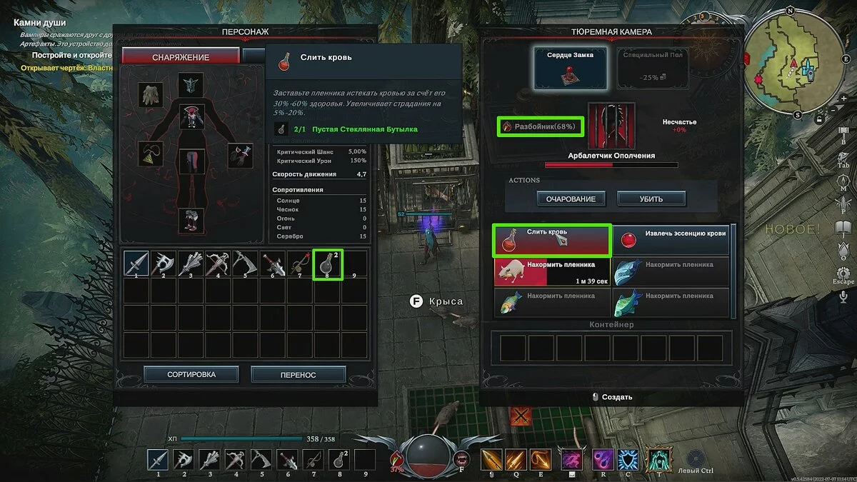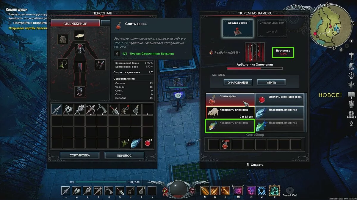Так вы создадите неиссякаемый источник, и вам не придётся постоянно исследовать открытый мир для поиска высокоуровневого ресурса. Но отыскать пять подходящих врагов и заточить их в клетках будет недостаточно. Каждое последующее извлечение крови увеличивает процент несчастья узника. Чем он выше, тем больше урона получит заключённый при извлечении.