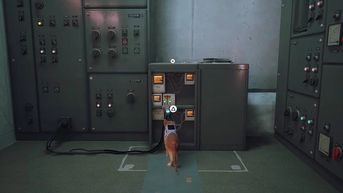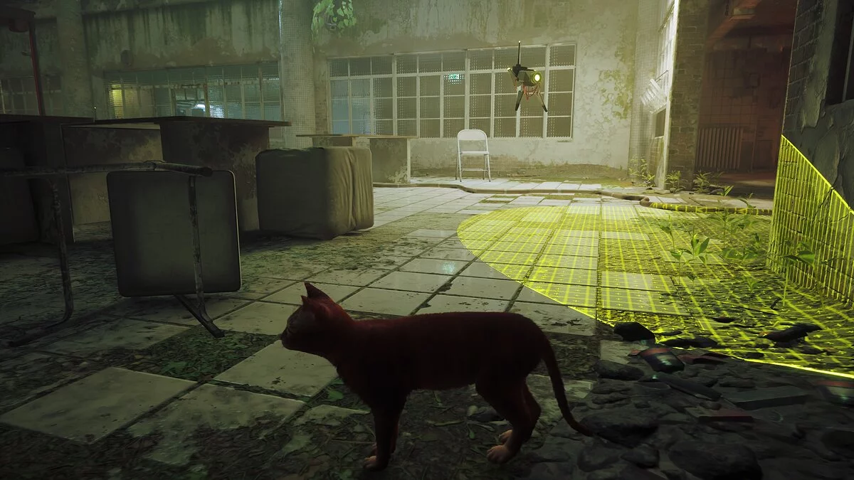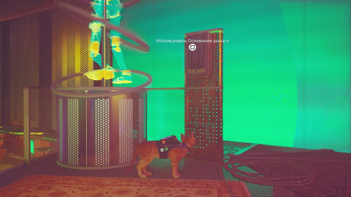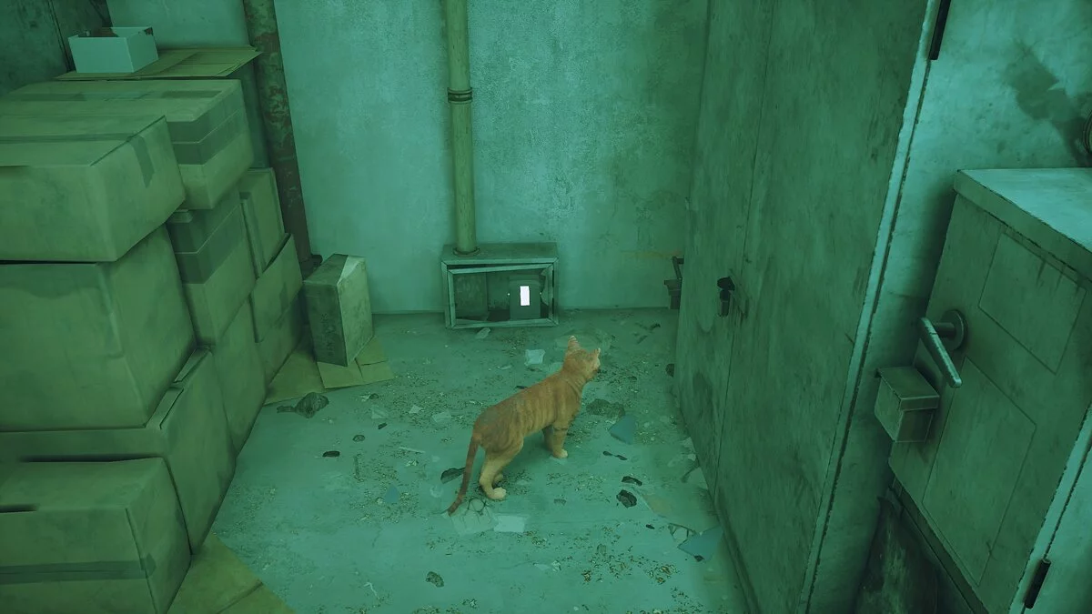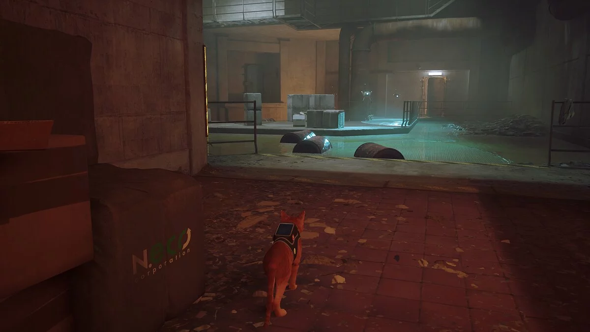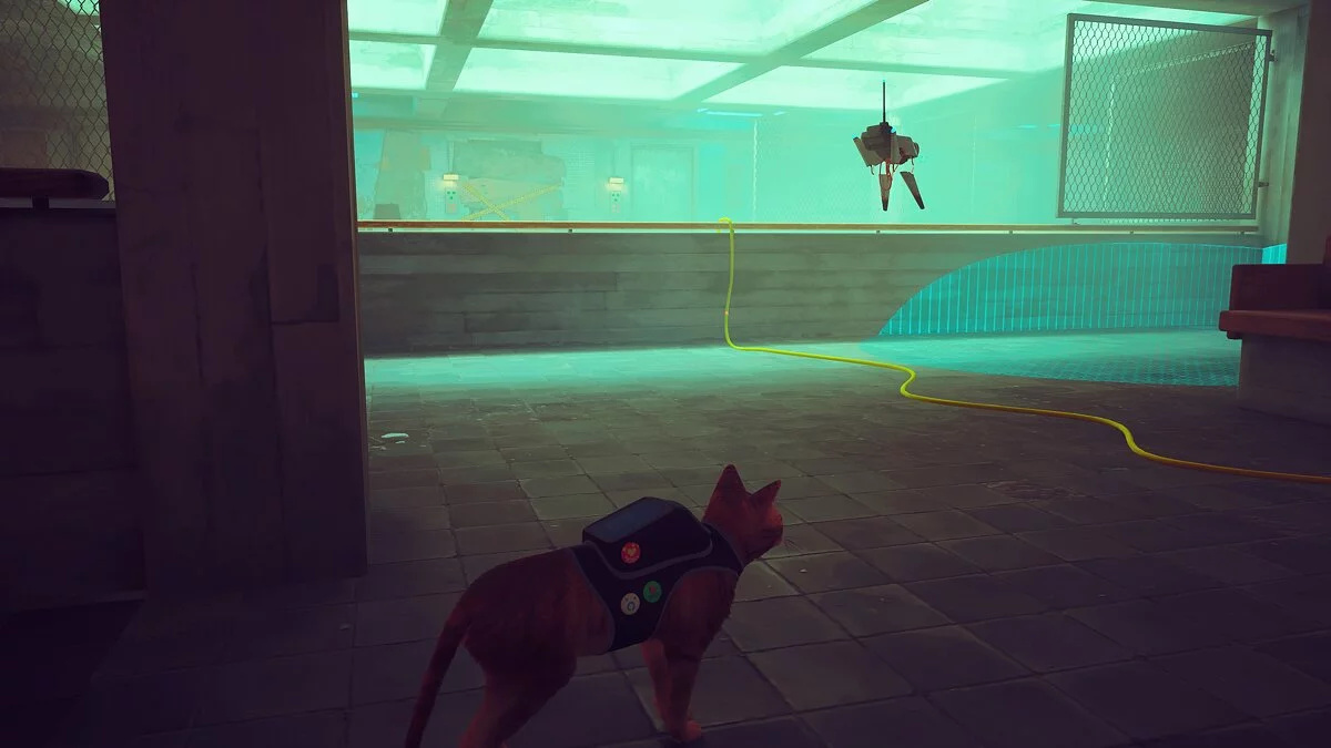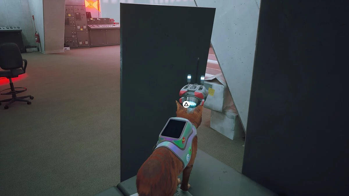 В следующей секции необходимо сразу использовать левый терминал и открыть дверь. Подзываем первого дрона и аккуратно мимо колонн выбегаем наружу. Снова мяукаем и призываем второе устройство. Как только оба дрона окажутся внутри, стараемся спрятаться подальше и быстро выбраться из камеры. Закрываем терминалы и проходим в следующую дверь. В этой ситуации необходимо, чтобы оба дрона использовали жёлтый прожектор. Так они не станут атаковать котика и будут двигаться гораздо медленнее.