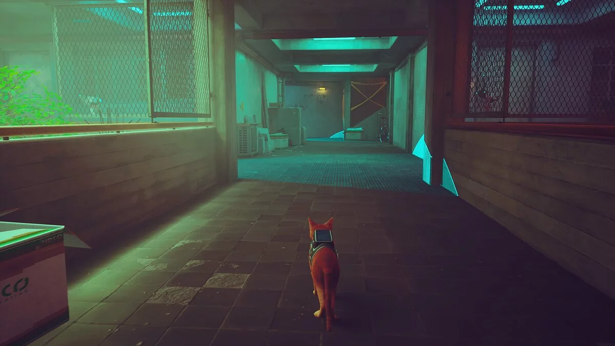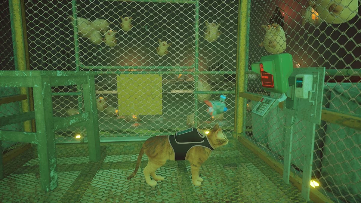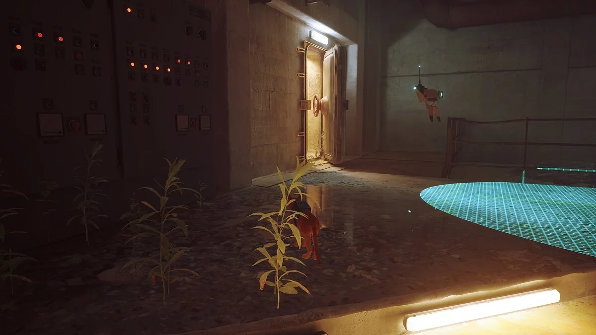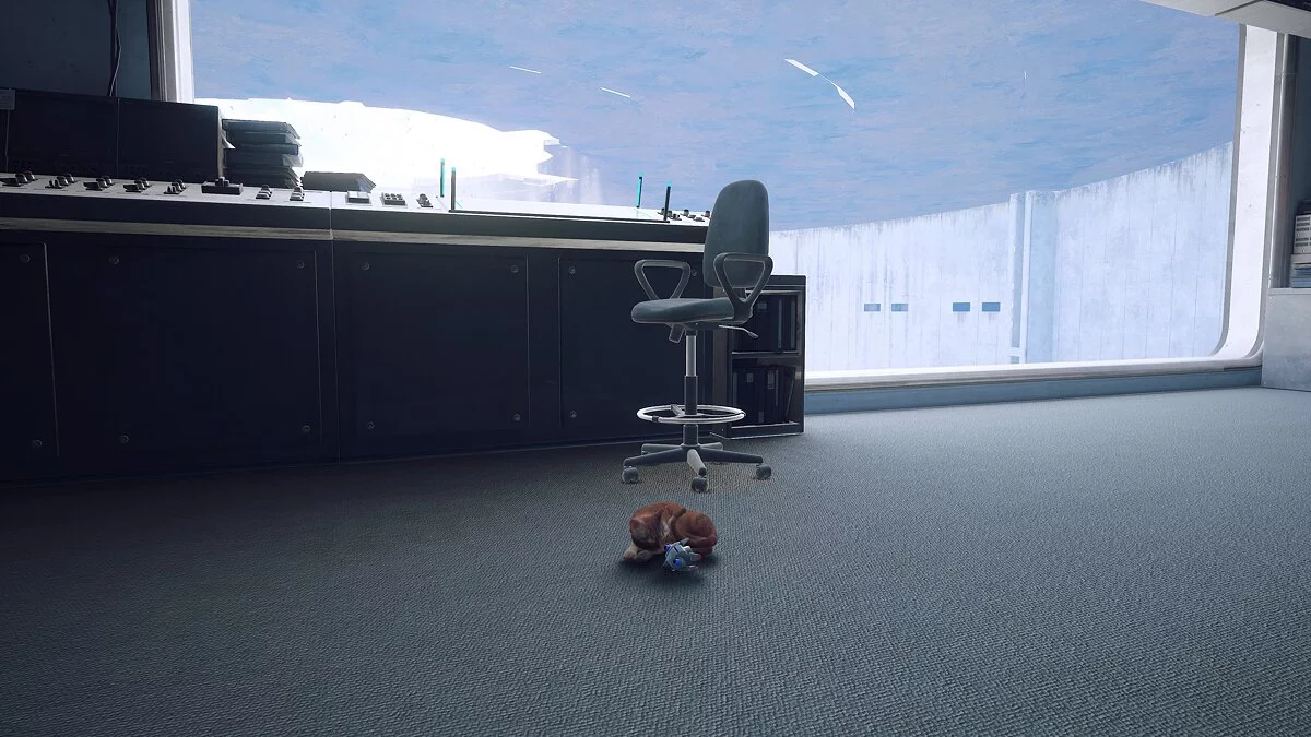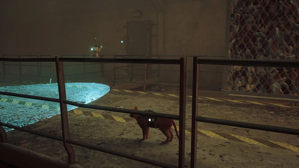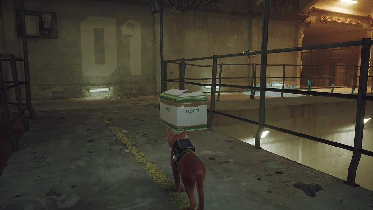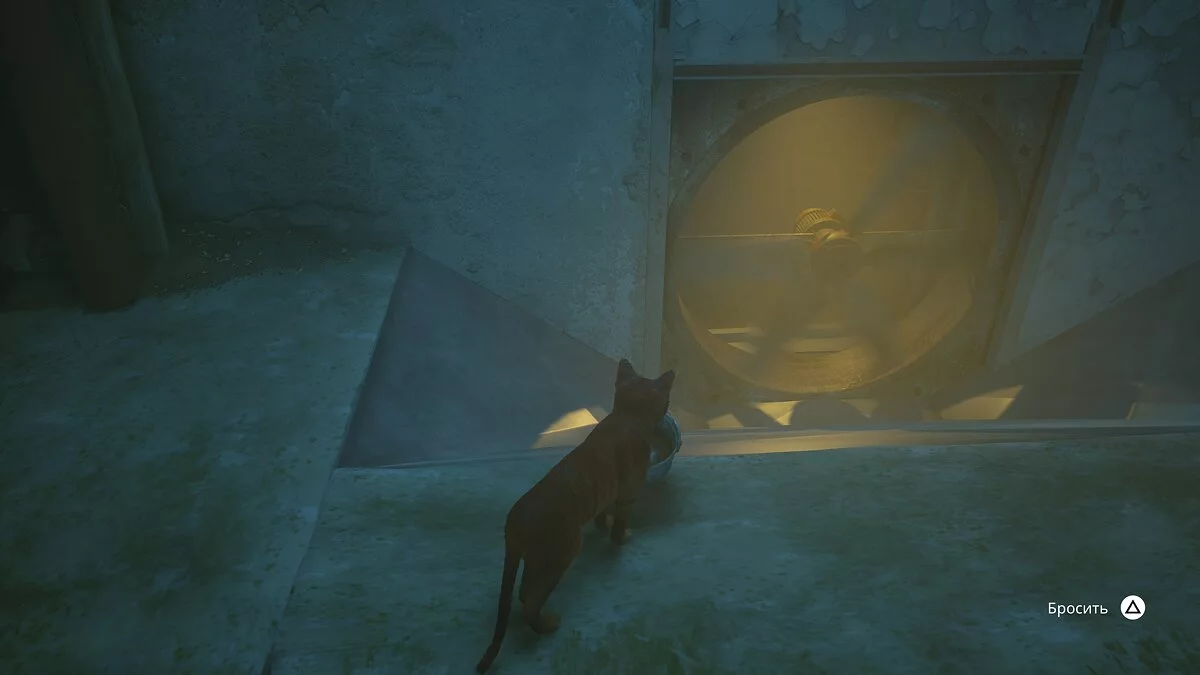 В следующей секции необходимо сразу использовать левый терминал и открыть дверь. Подзываем первого дрона и аккуратно мимо колонн выбегаем наружу. Снова мяукаем и призываем второе устройство. Как только оба дрона окажутся внутри, стараемся спрятаться подальше и быстро выбраться из камеры. Закрываем терминалы и проходим в следующую дверь. В этой ситуации необходимо, чтобы оба дрона использовали жёлтый прожектор. Так они не станут атаковать котика и будут двигаться гораздо медленнее.