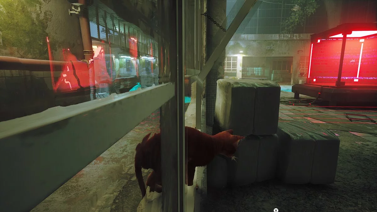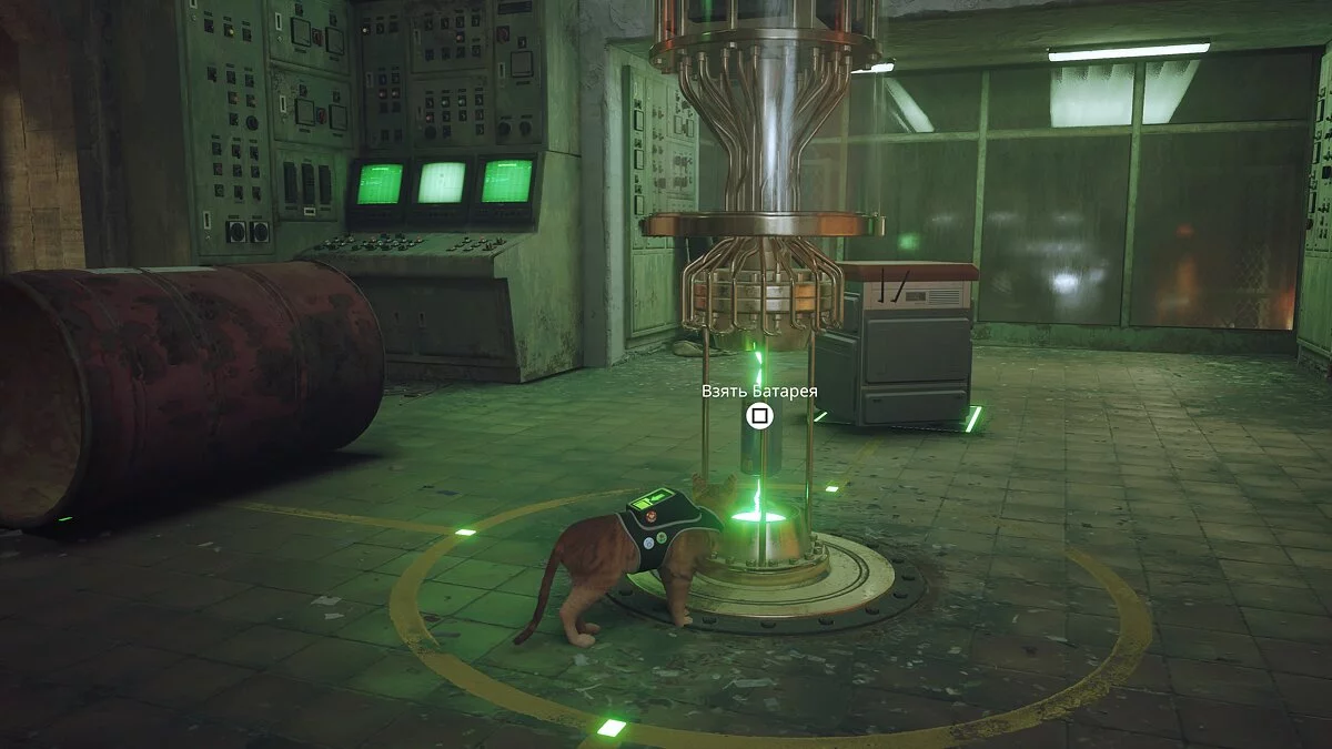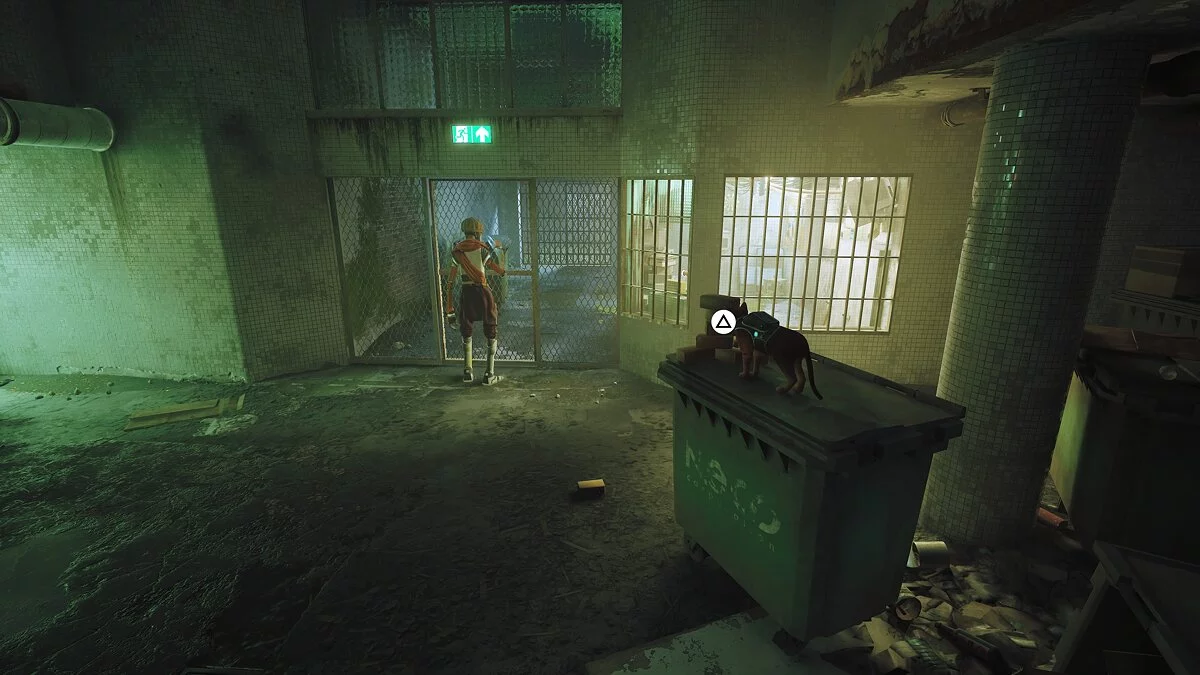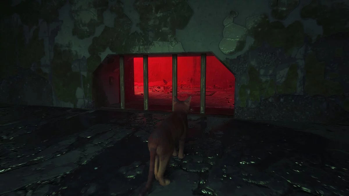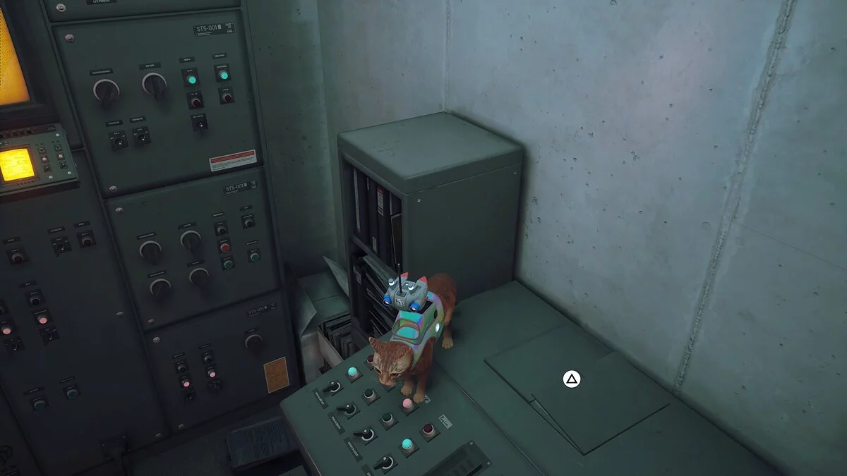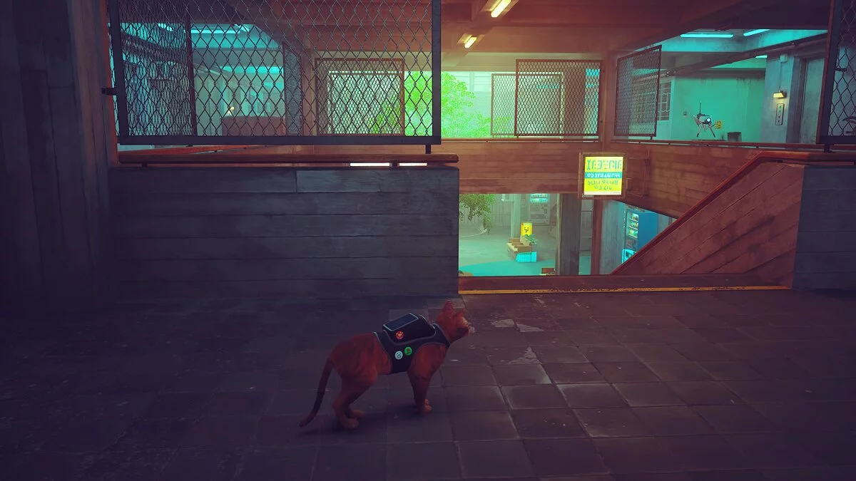 В следующей секции необходимо сразу использовать левый терминал и открыть дверь. Подзываем первого дрона и аккуратно мимо колонн выбегаем наружу. Снова мяукаем и призываем второе устройство. Как только оба дрона окажутся внутри, стараемся спрятаться подальше и быстро выбраться из камеры. Закрываем терминалы и проходим в следующую дверь. В этой ситуации необходимо, чтобы оба дрона использовали жёлтый прожектор. Так они не станут атаковать котика и будут двигаться гораздо медленнее.