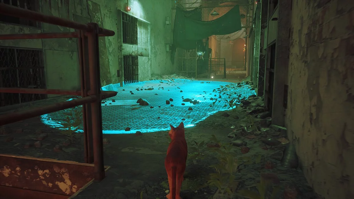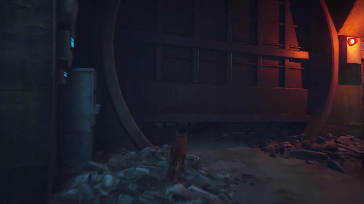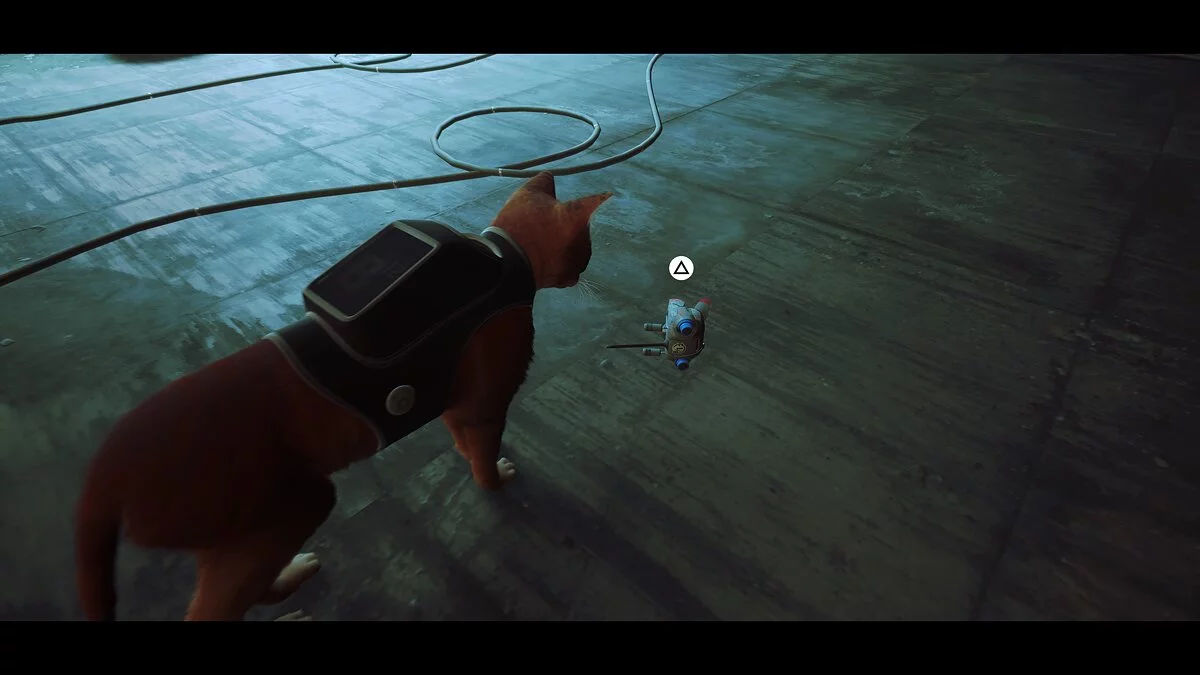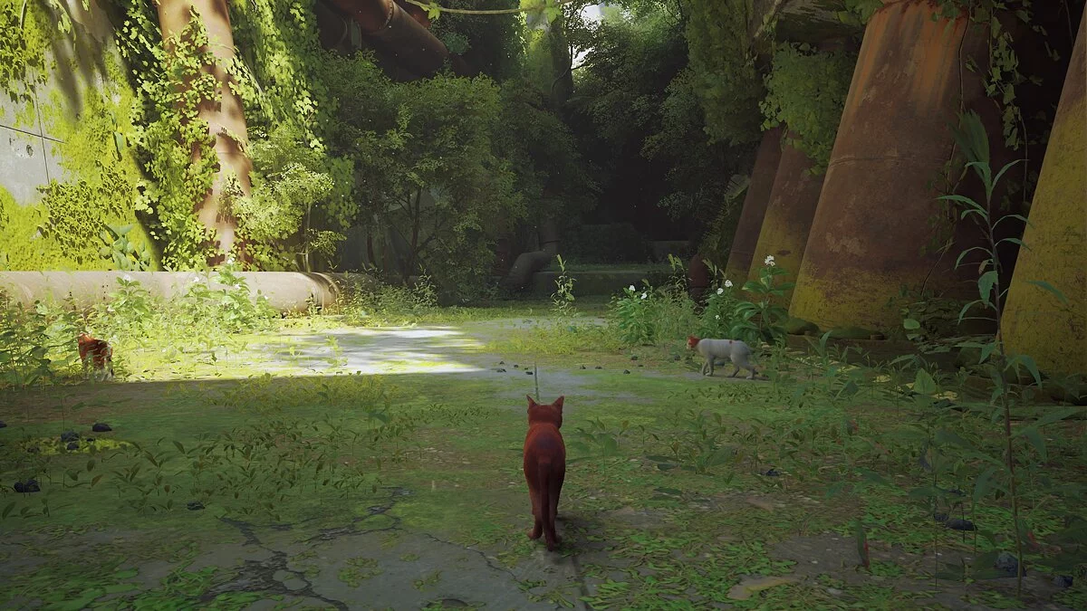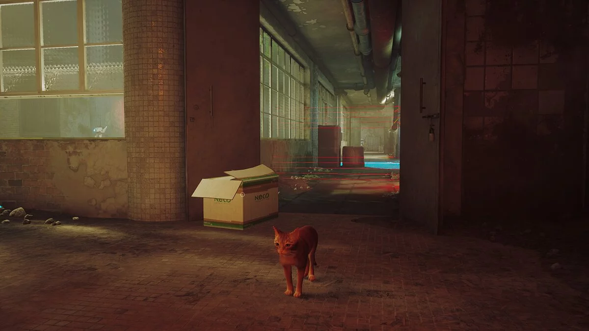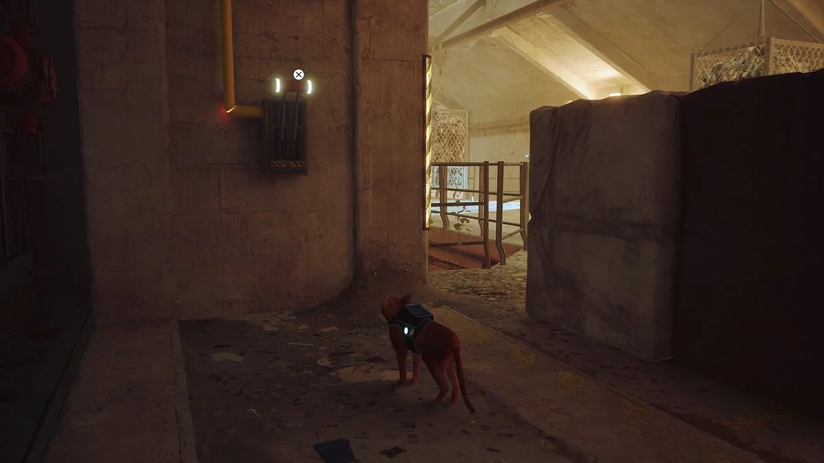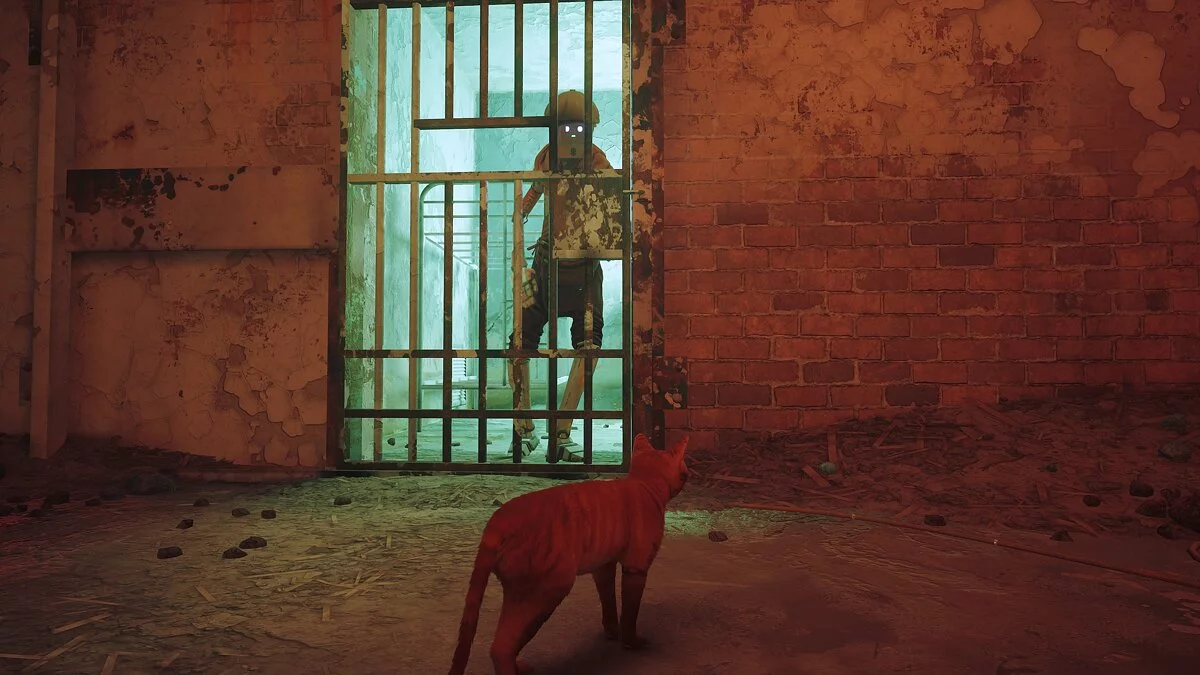 В следующей секции необходимо сразу использовать левый терминал и открыть дверь. Подзываем первого дрона и аккуратно мимо колонн выбегаем наружу. Снова мяукаем и призываем второе устройство. Как только оба дрона окажутся внутри, стараемся спрятаться подальше и быстро выбраться из камеры. Закрываем терминалы и проходим в следующую дверь. В этой ситуации необходимо, чтобы оба дрона использовали жёлтый прожектор. Так они не станут атаковать котика и будут двигаться гораздо медленнее.