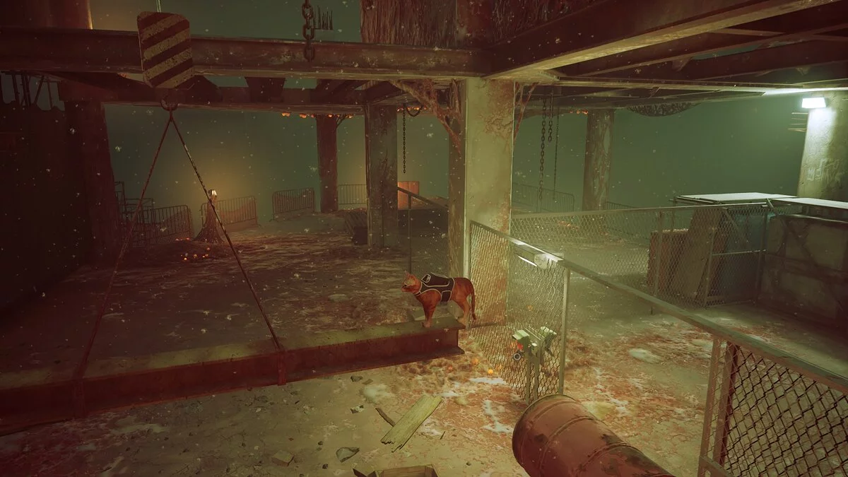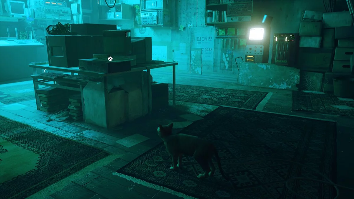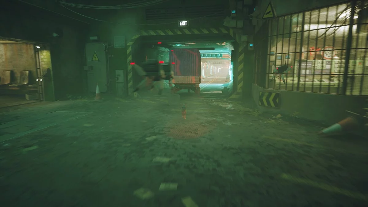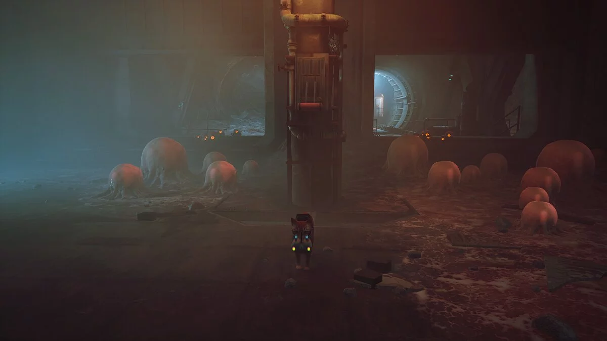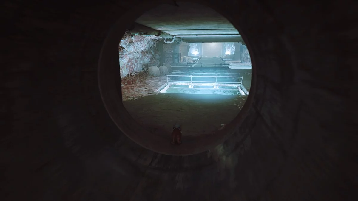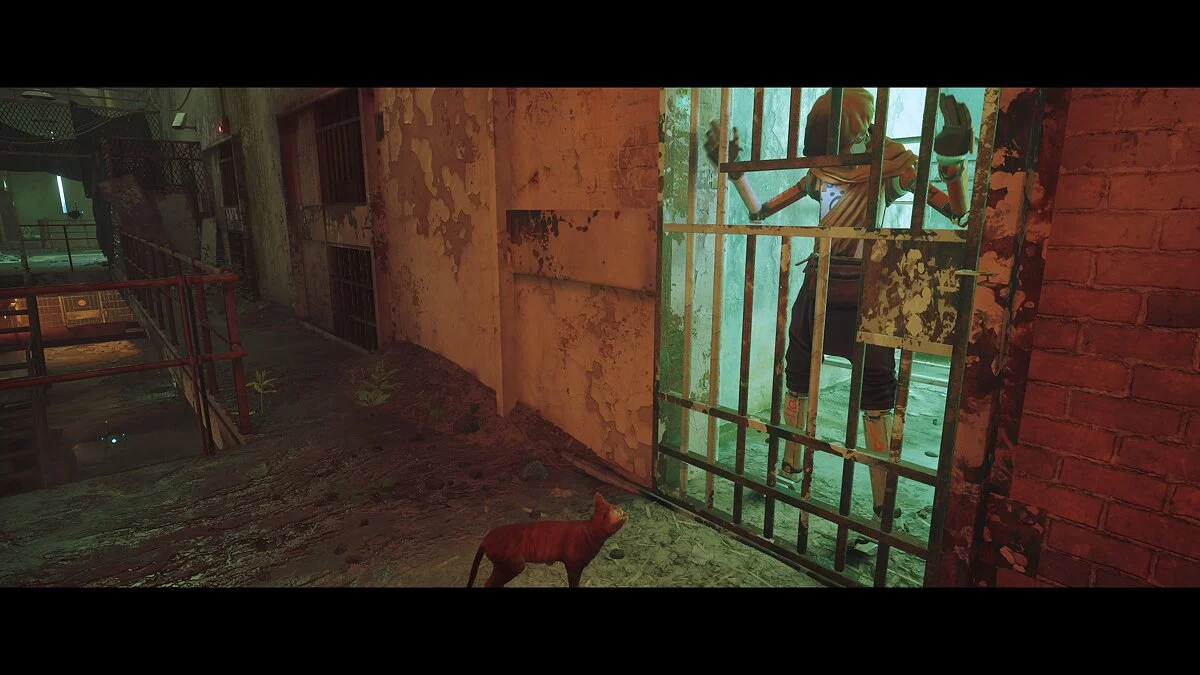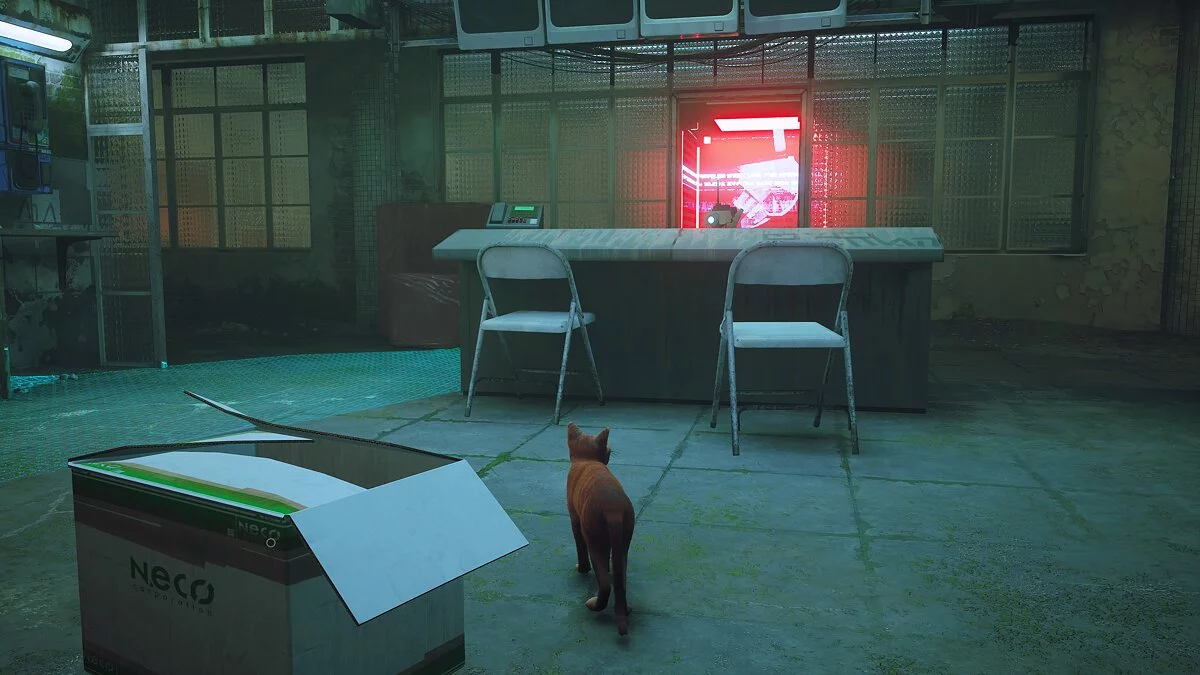 В следующей секции необходимо сразу использовать левый терминал и открыть дверь. Подзываем первого дрона и аккуратно мимо колонн выбегаем наружу. Снова мяукаем и призываем второе устройство. Как только оба дрона окажутся внутри, стараемся спрятаться подальше и быстро выбраться из камеры. Закрываем терминалы и проходим в следующую дверь. В этой ситуации необходимо, чтобы оба дрона использовали жёлтый прожектор. Так они не станут атаковать котика и будут двигаться гораздо медленнее.