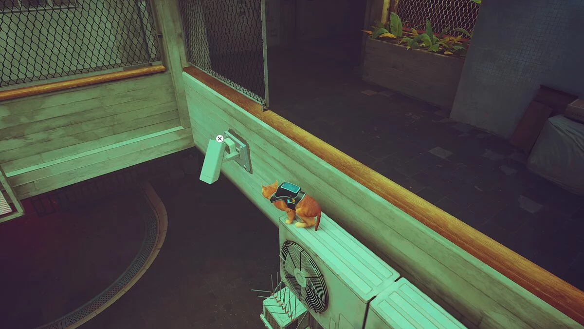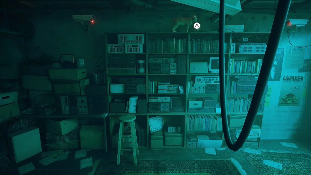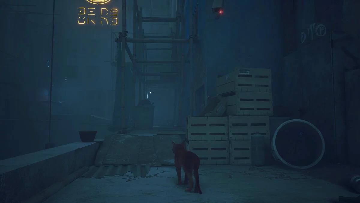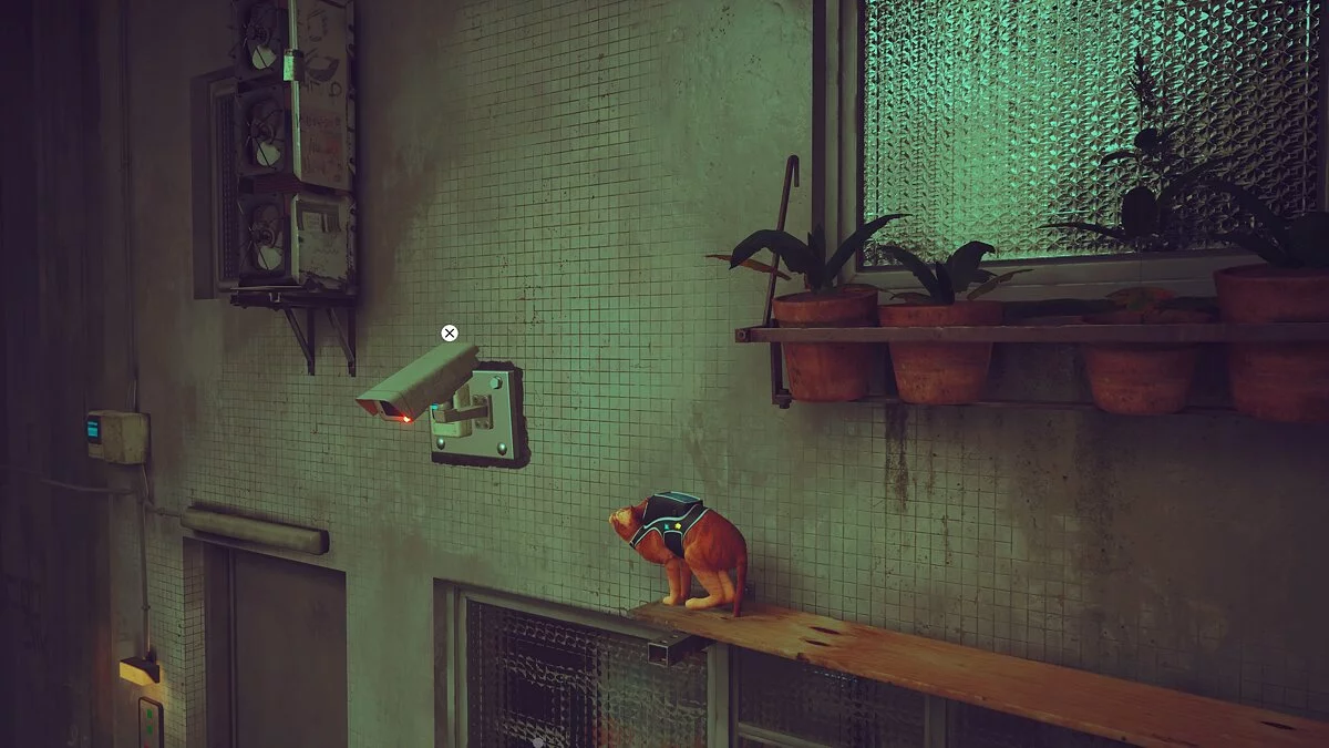 Сделать это не получится, поэтому котику придётся сломать три камеры, каждая из которых находится на втором этаже. Два устройства расположены над роботом рядом с перилами, а третье — на стене.