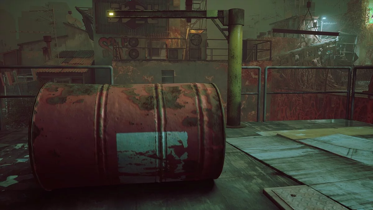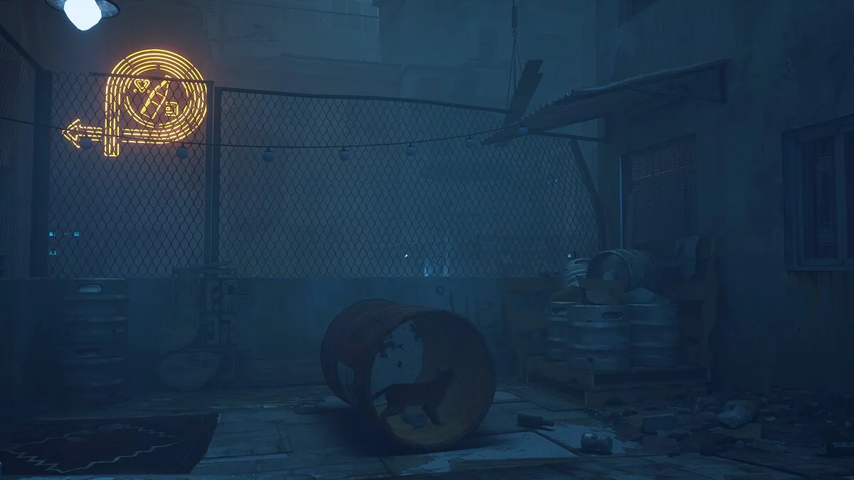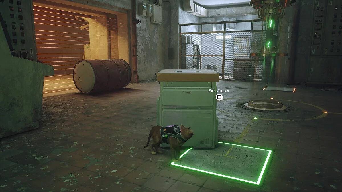 Спрыгиваем на бочки и сразу же перелезаем на соседние справа. Забираем ключи и по контейнерам добираемся в следующую локацию. Используем рычаг и сразу жу прячемся за ящиками слева. Котик окажется в помещении со вторым и третьим дронами.