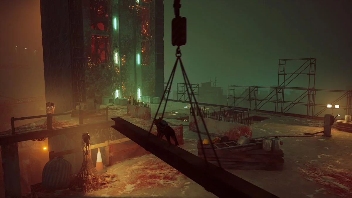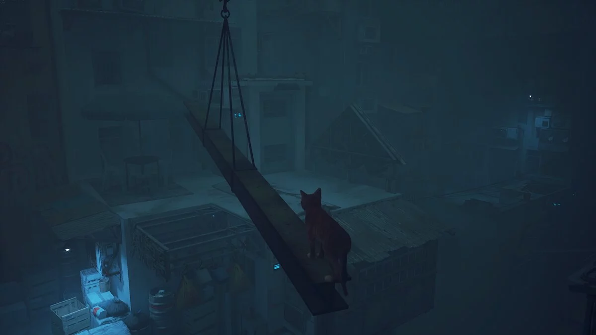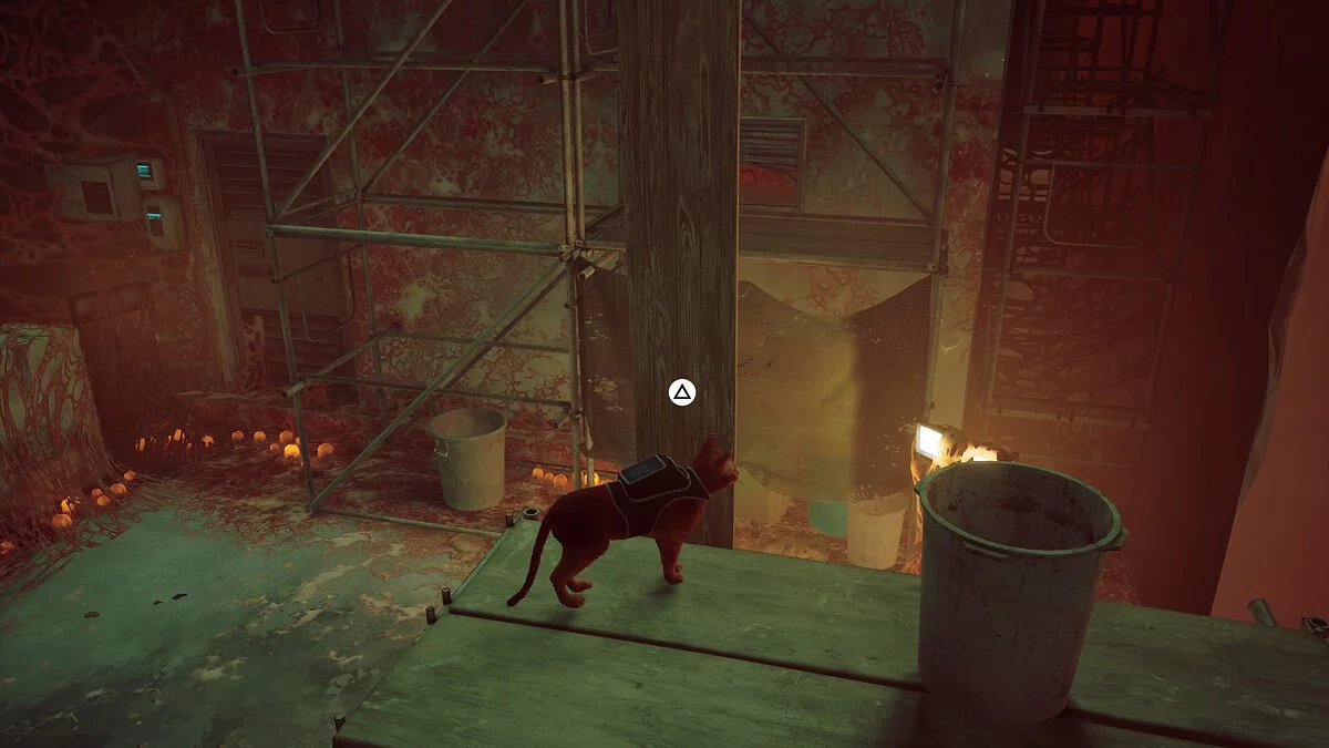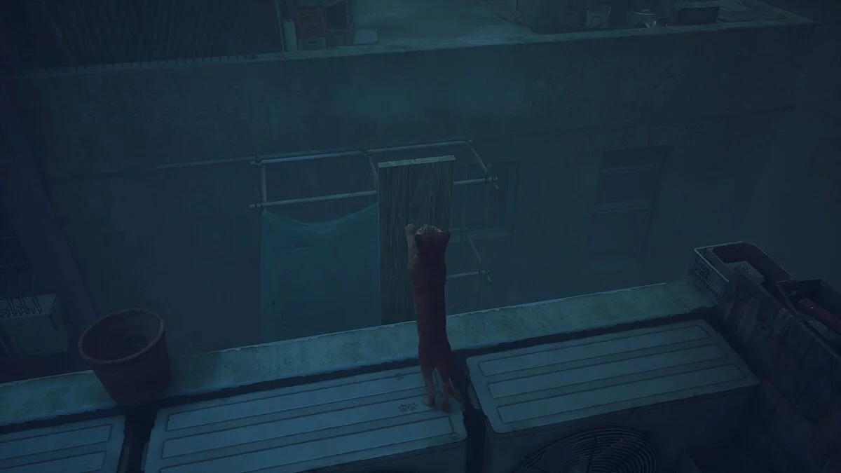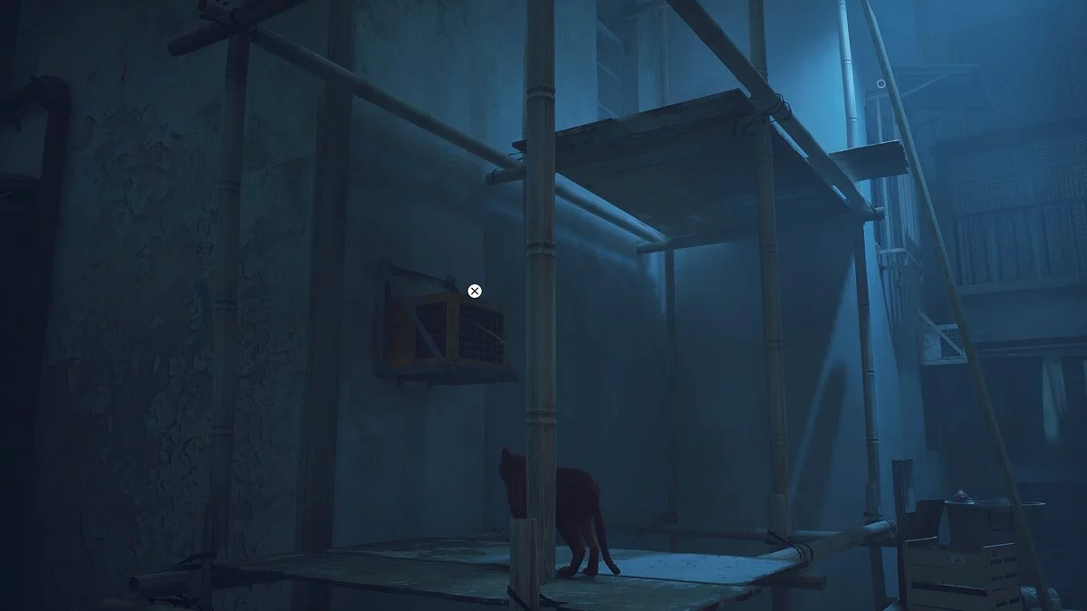 Залезаем на соседнее здание и идём к строительным лесам. При попытке перепрыгнуть, кот упадёт на уровень ниже.