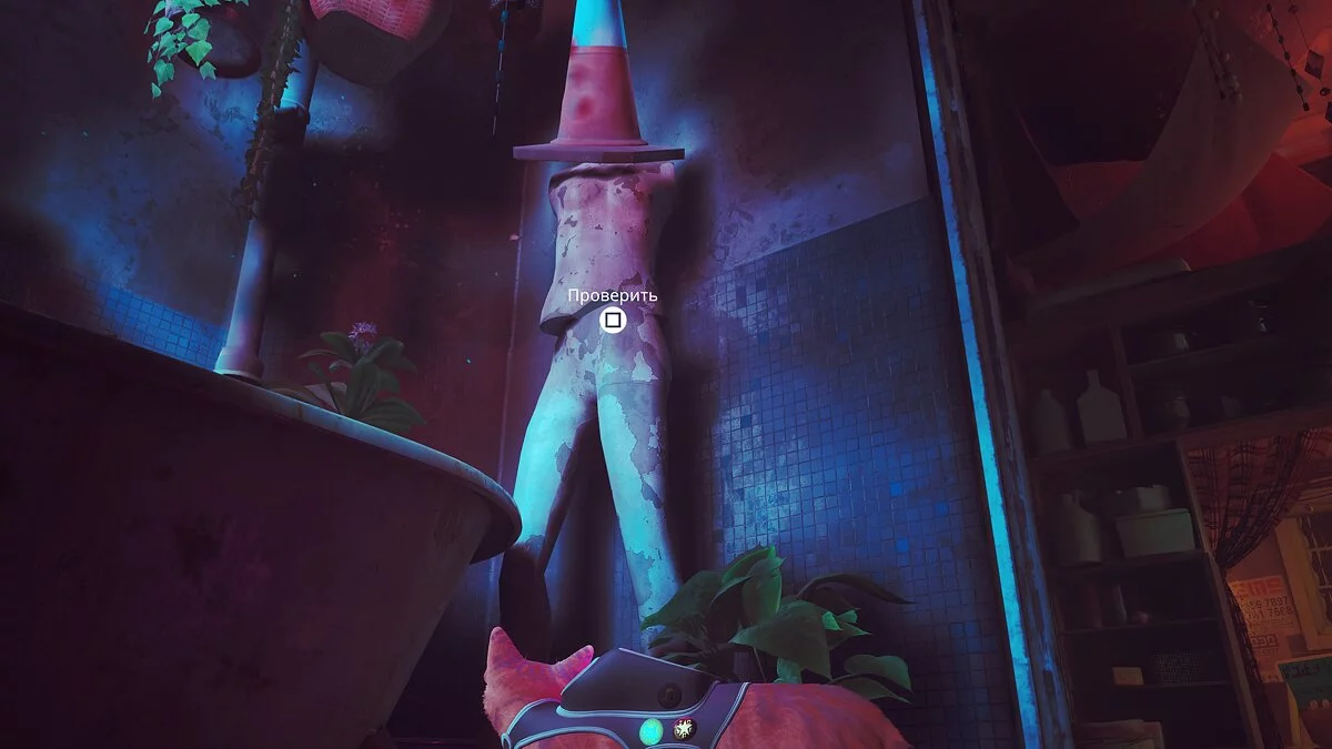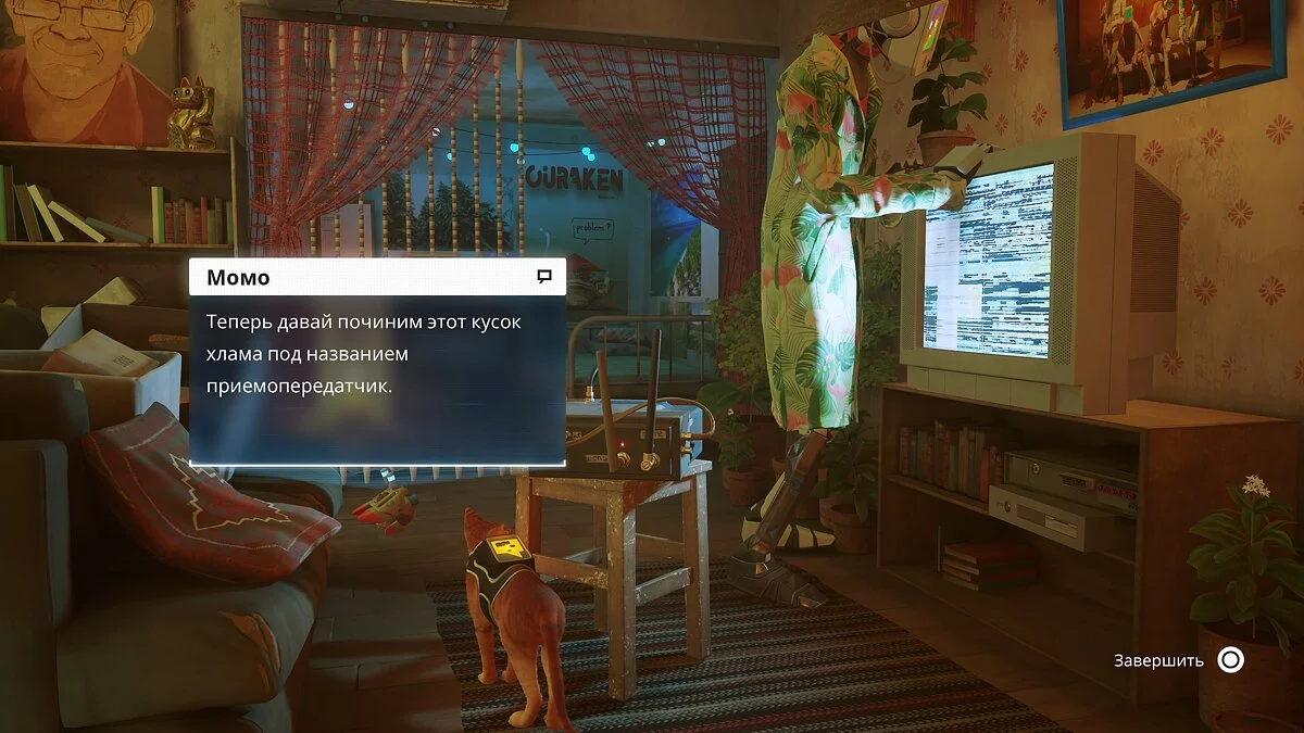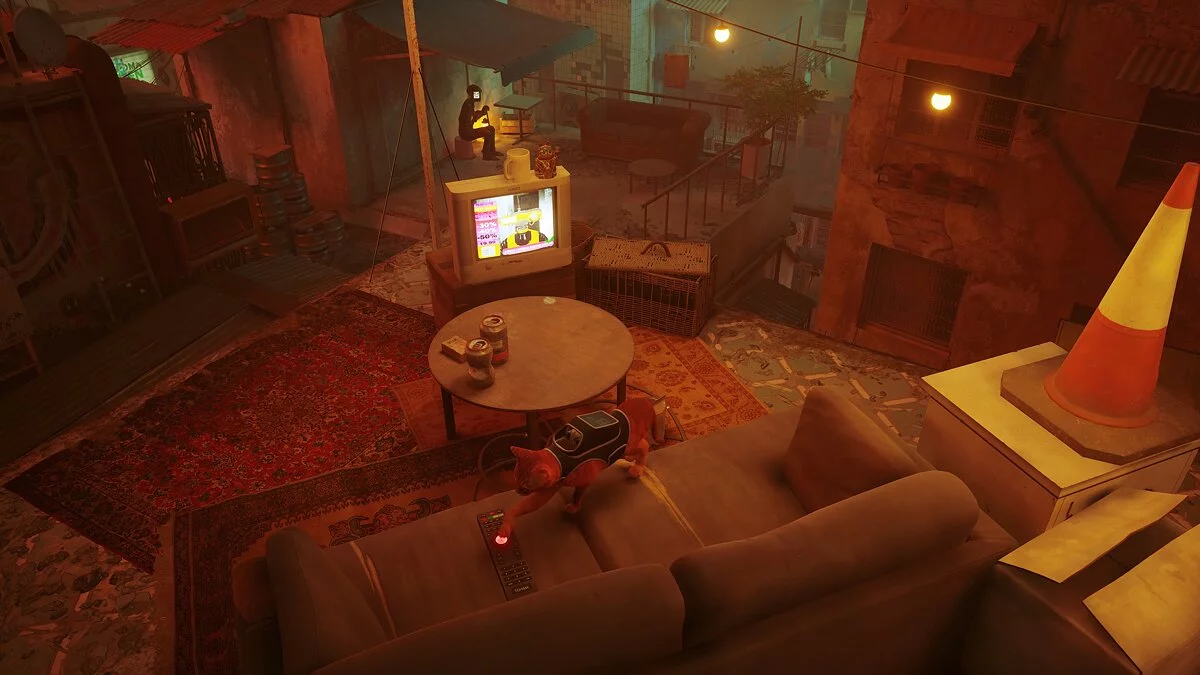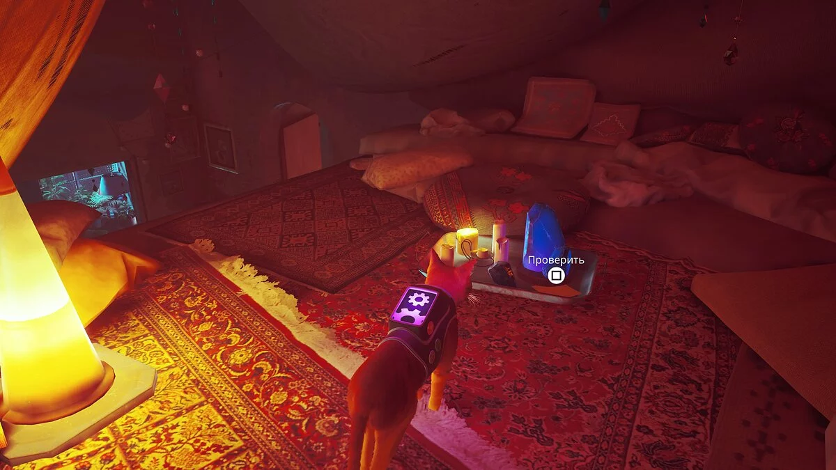 Выходим наружу и на соседней крыше находим диван. Залезаем на него и активируем пульт. Несколько раз переключаем каналы, пока не получим достижение «Теле-кот».