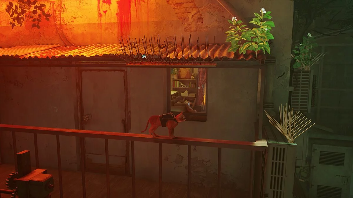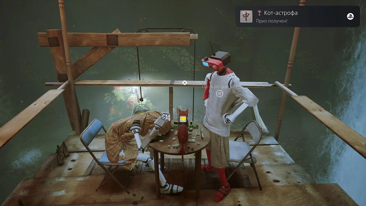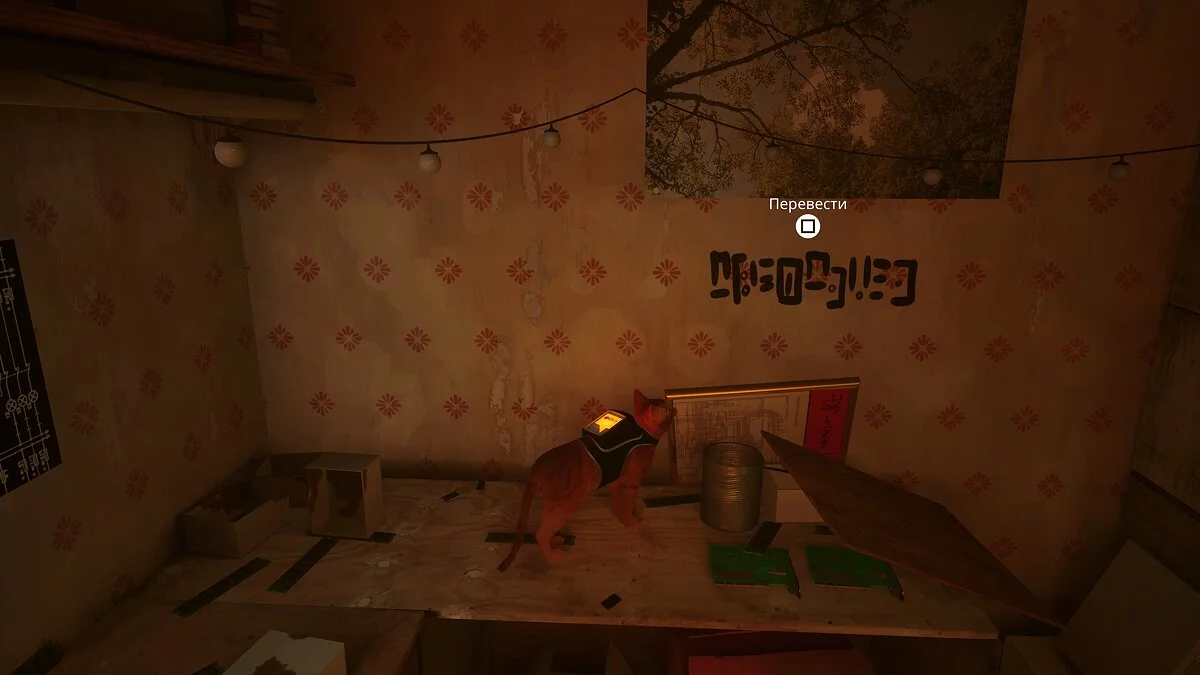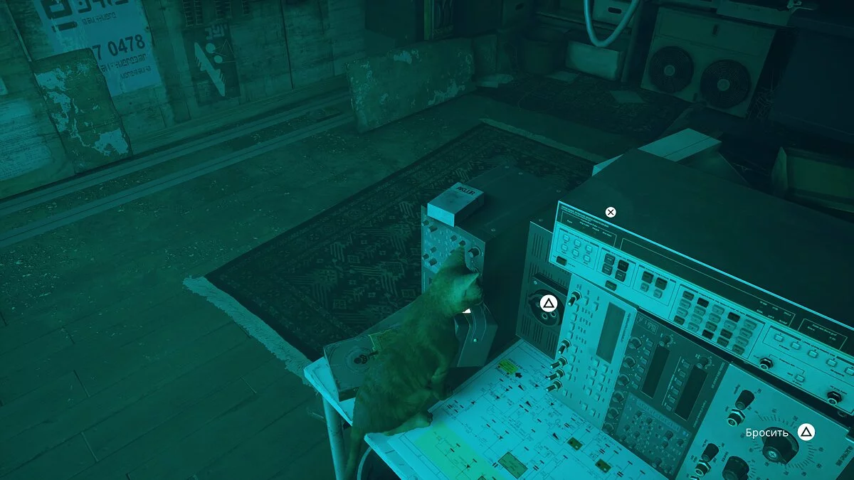 Выходим наружу и на соседней крыше находим диван. Залезаем на него и активируем пульт. Несколько раз переключаем каналы, пока не получим достижение «Теле-кот».