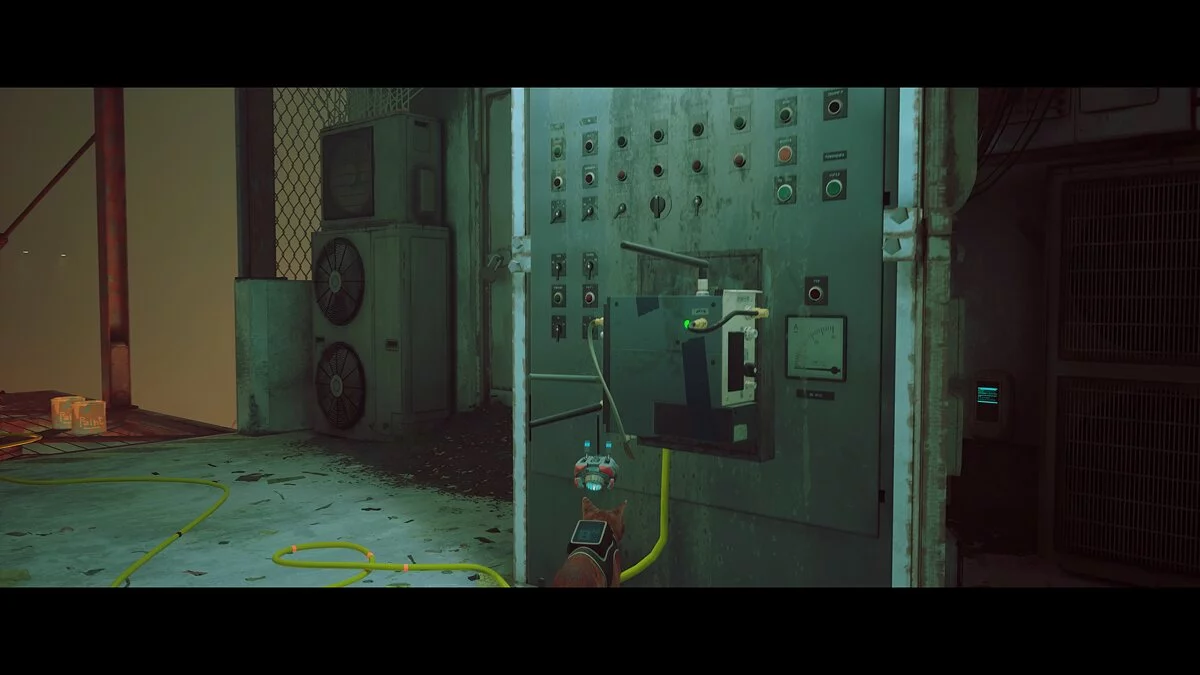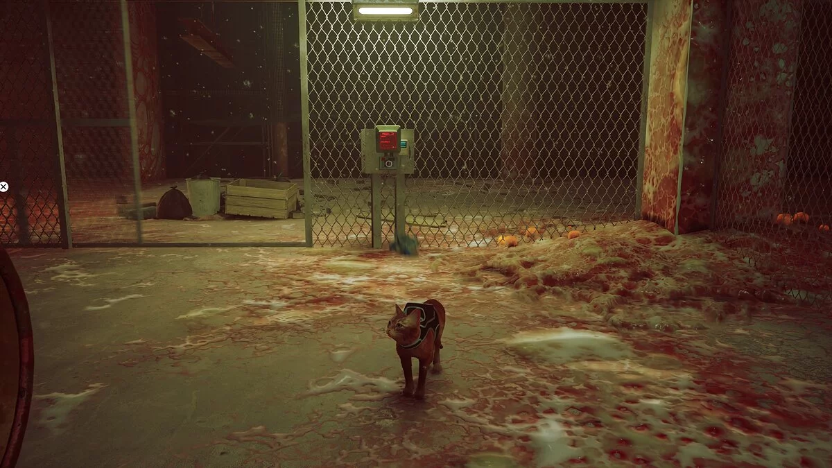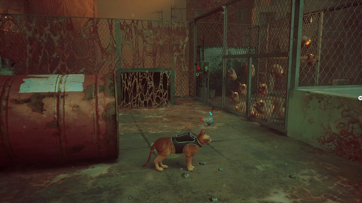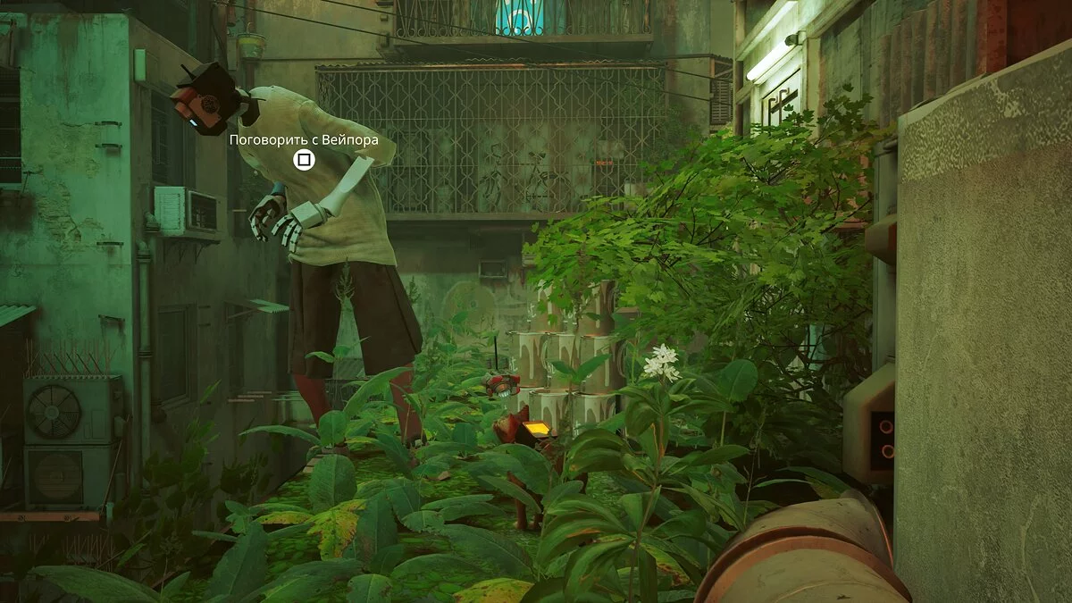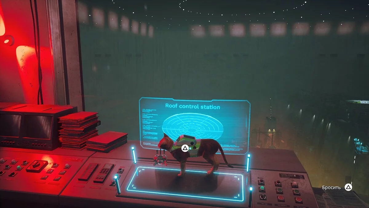 Во дворике мяукаем и заманиваем дрона в открытую камеру. Прячемся за ящиками и быстро выбегаем из помещения. Используем терминал и закрываем робота внутри. Клементина откроет следующую зону.