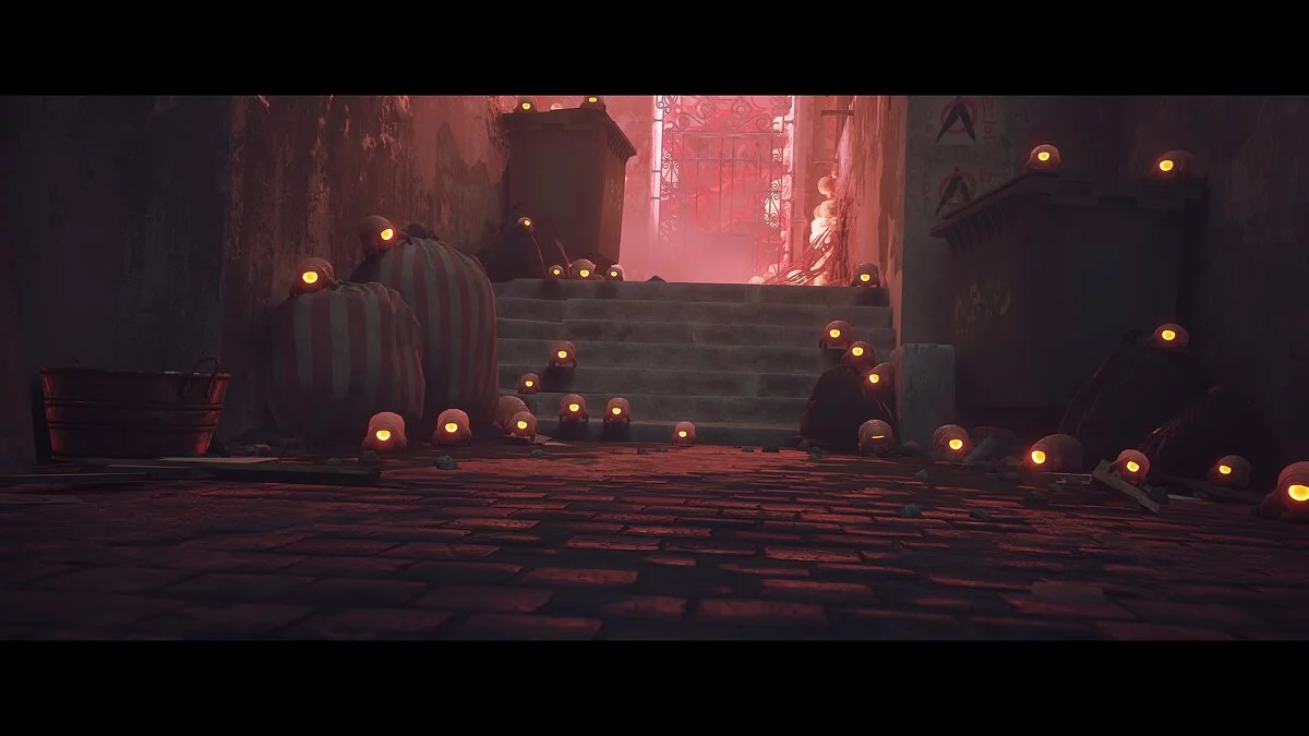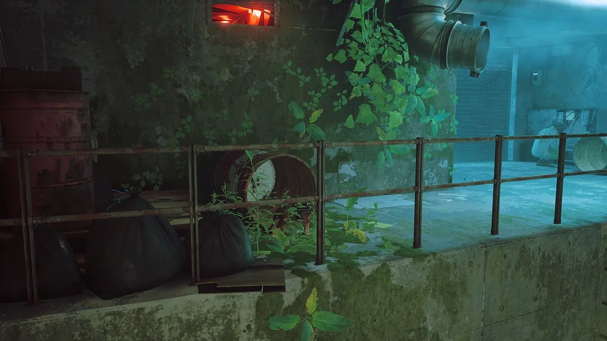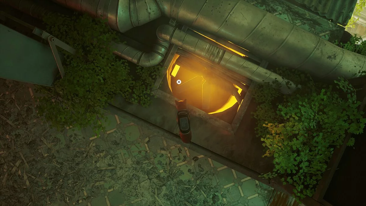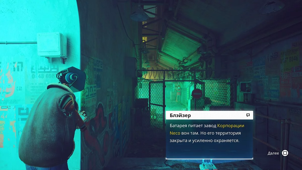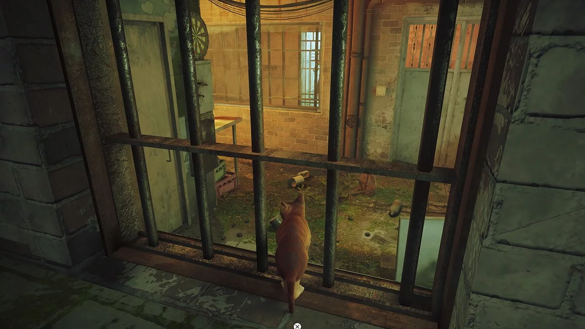 Во дворике мяукаем и заманиваем дрона в открытую камеру. Прячемся за ящиками и быстро выбегаем из помещения. Используем терминал и закрываем робота внутри. Клементина откроет следующую зону.