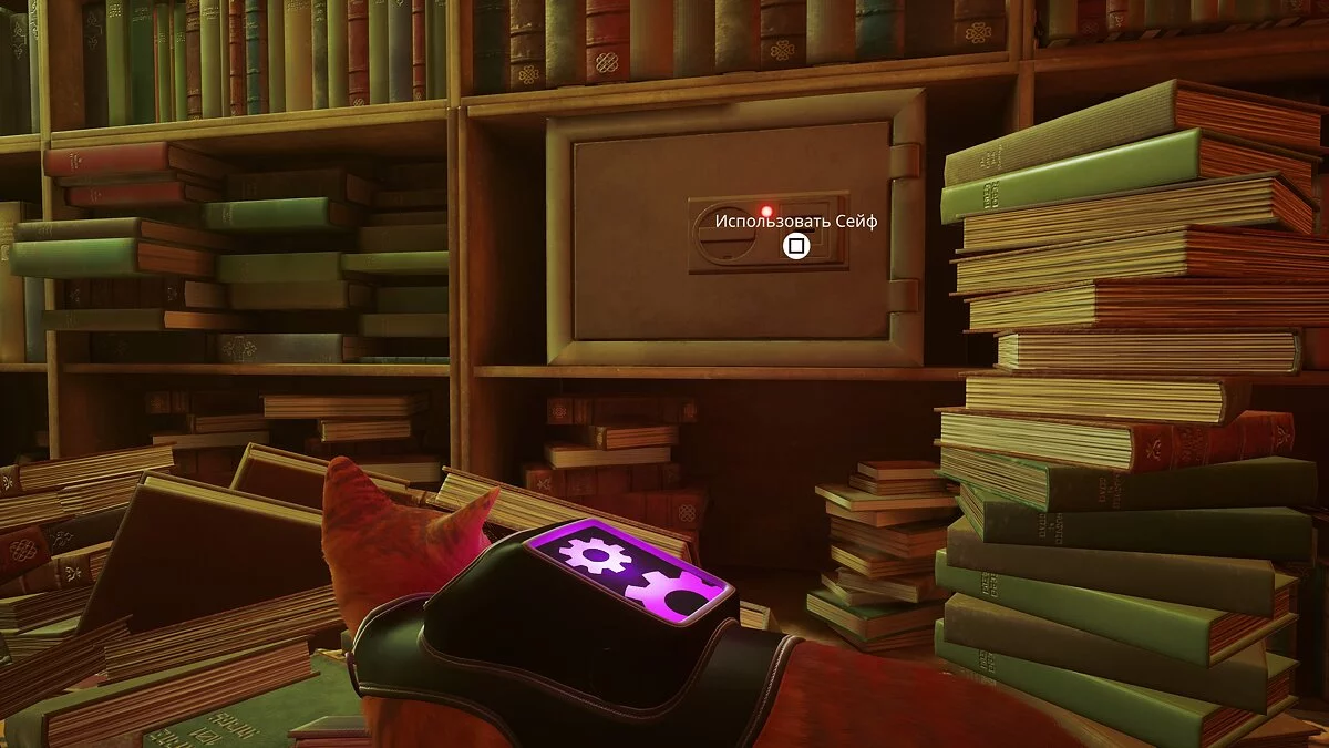 - Док. От квартиры Момо двигаемся направо в библиотеку. Внутри находим ключи в помещении за книгами с фиолетовым светом. В проходе отодвигаем стопки рукописей и открываем сейф. Внутри будет лежать предмет.