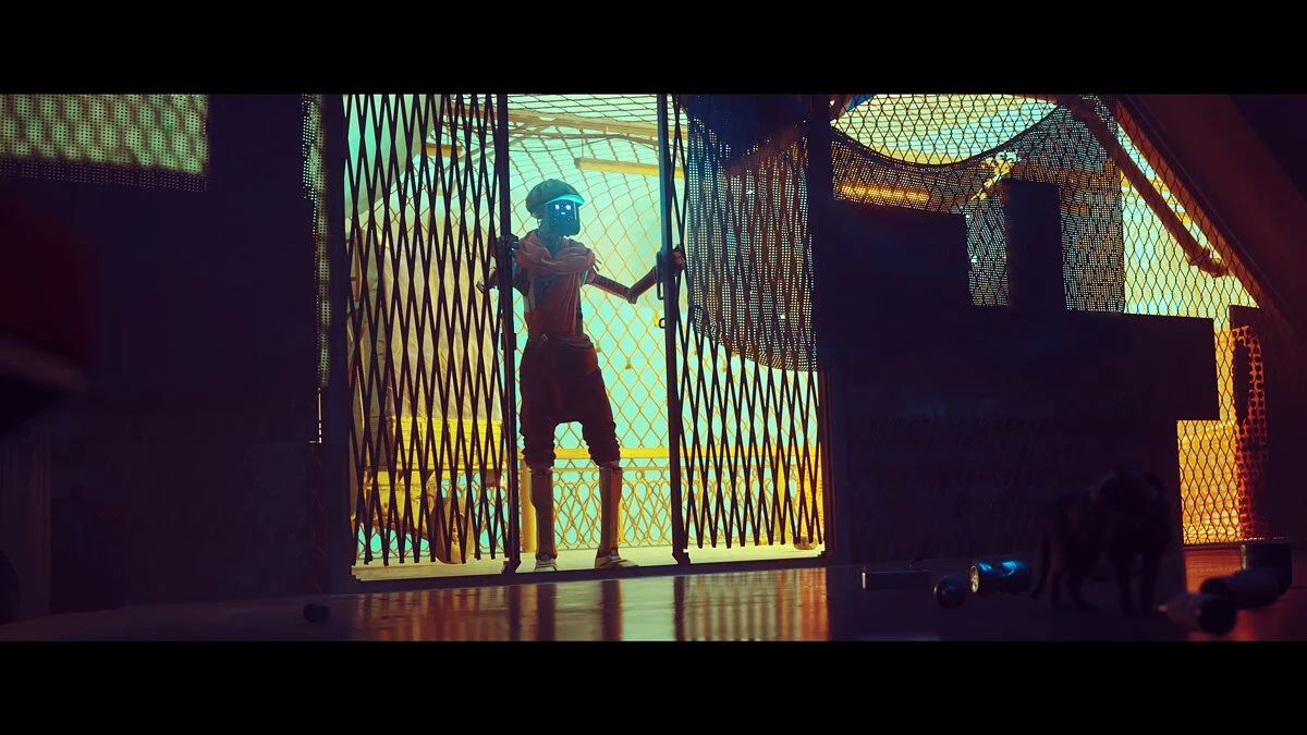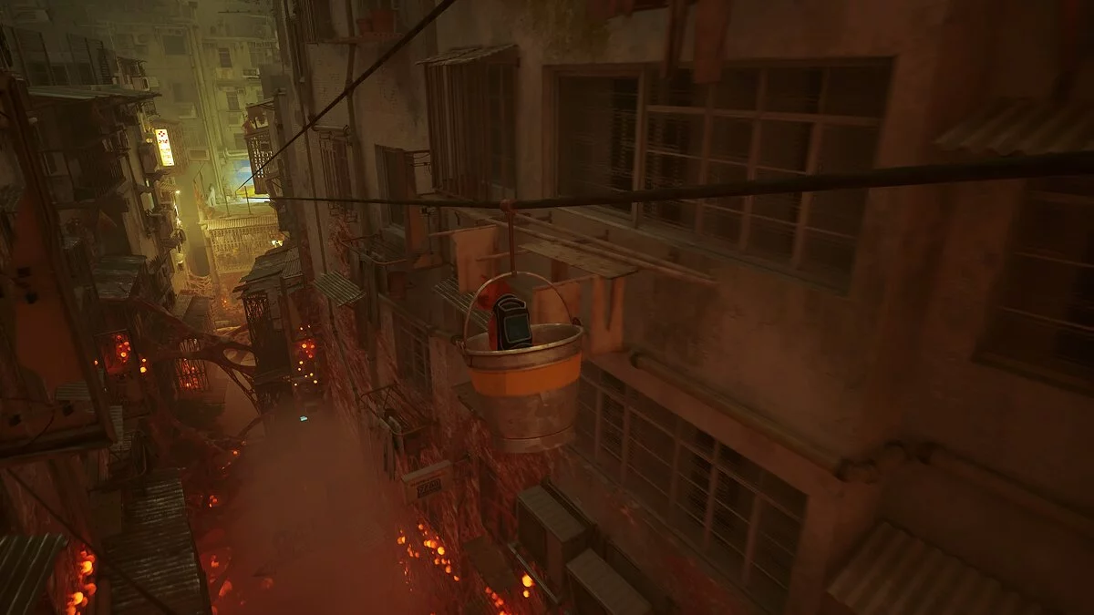 Дожидаемся левого дрона. Как только он развернётся в обратном направлении, запрыгиваем на перила и слезаем на платформу. Проходим по ней до упора и дожидаемся дрона, который полетит в другую сторону. Вылезаем позади него и уходим на верхний этаж.