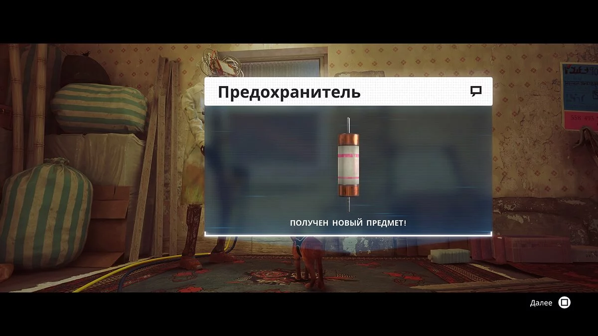 Вытаскиваем предмет слева за коробками для отключения лопастей. Используем отверстие и попадаем в квартиру.