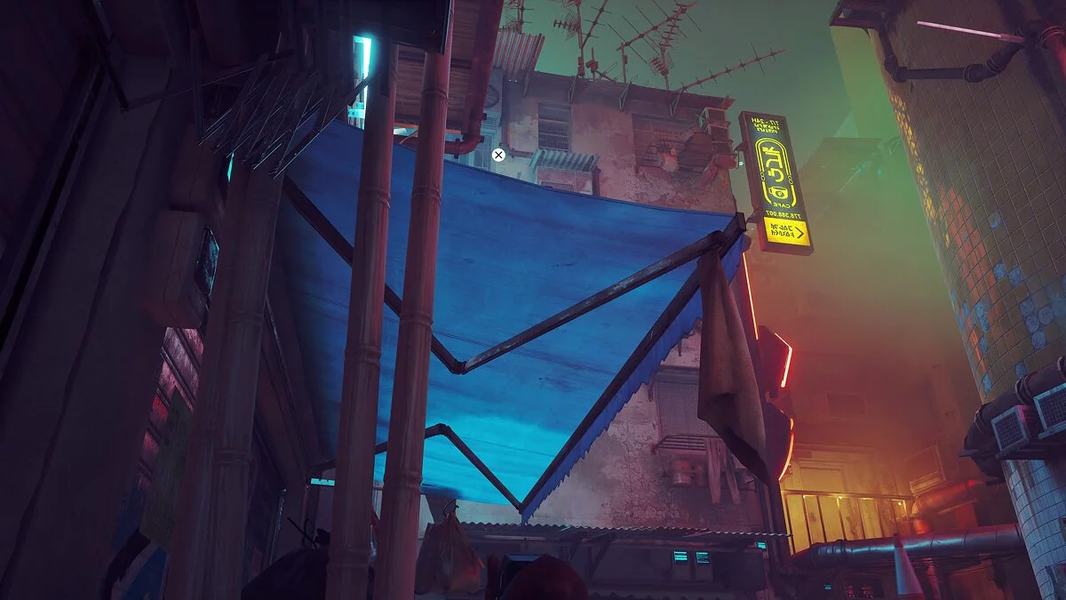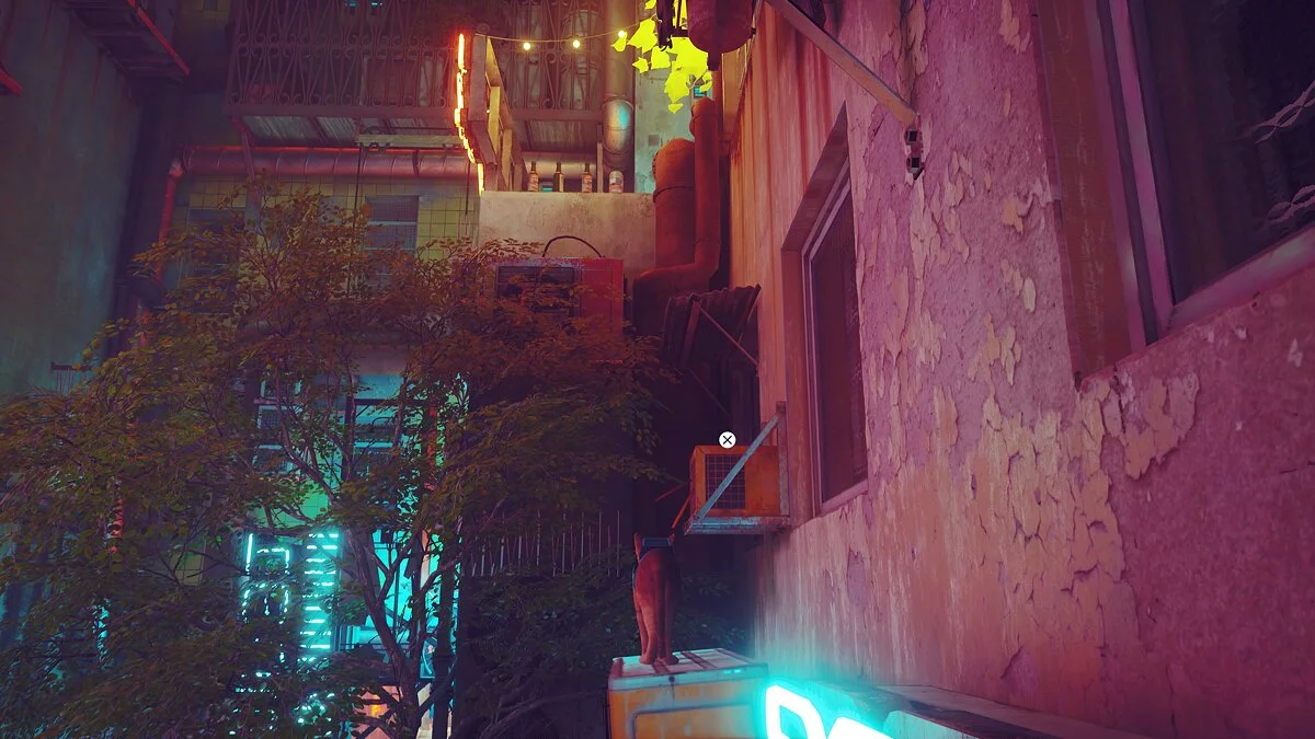 Перебираемся на другое строение и осматриваем неоновую вывеску, чтобы открыть воспоминание. С помощью балки и козырька крыши перебираемся дальше.