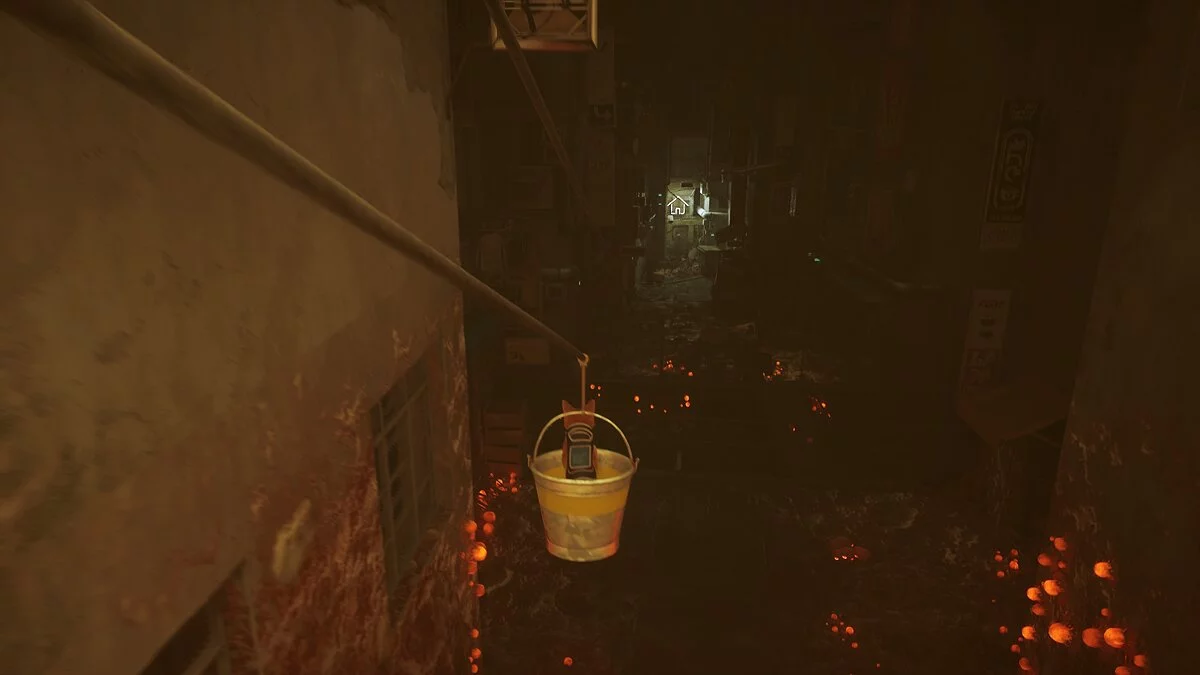 Вытаскиваем батарею, выходим наружу и забираемся в ведро, чтобы покинуть фабрику.
