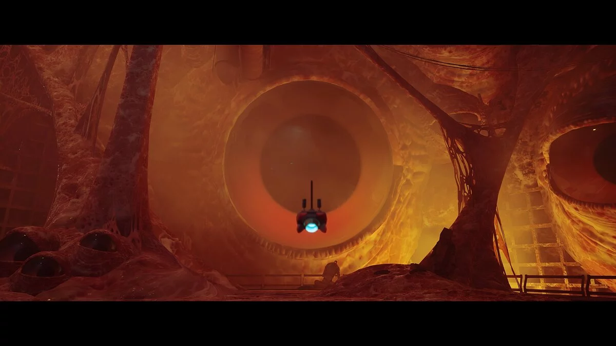 Выходим из центра управления и подходим к большим красным дверям. Идём вперёд, как только они откроются.