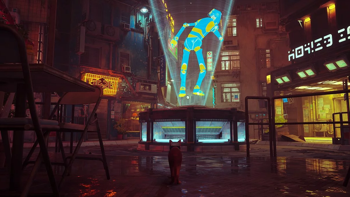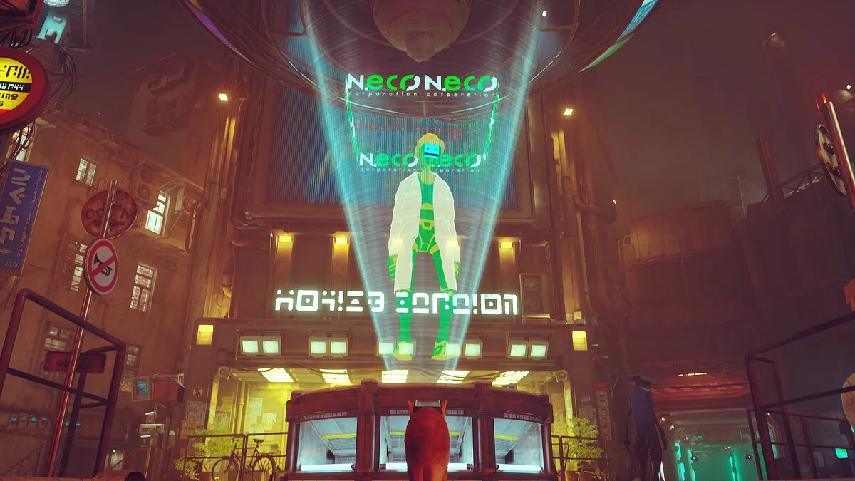 Выбираемся на улицу. Обходим голограмму справа, спускаемся по лестнице и сворачиваем в переулок.