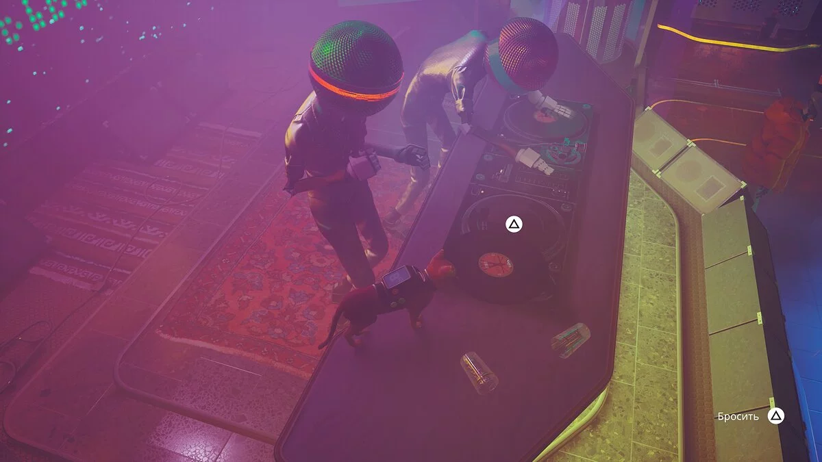 На самом крайнем круглом столике слева от сцены находится виниловая пластинка. Забираем её и залезаем на диджейский пульт. Устанавливаем пластинку и точим об неё когти для получения достижения «Царапки».