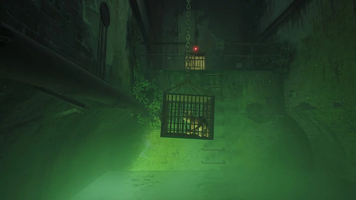 Раскачиваем клетку влево и вправо. Выбираемся по трубе к запертой двери.