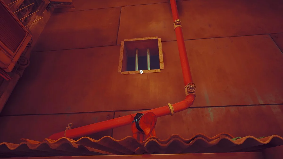 Следуем вперёд, залезаем на козырёк дома и перебираемся через решётку.