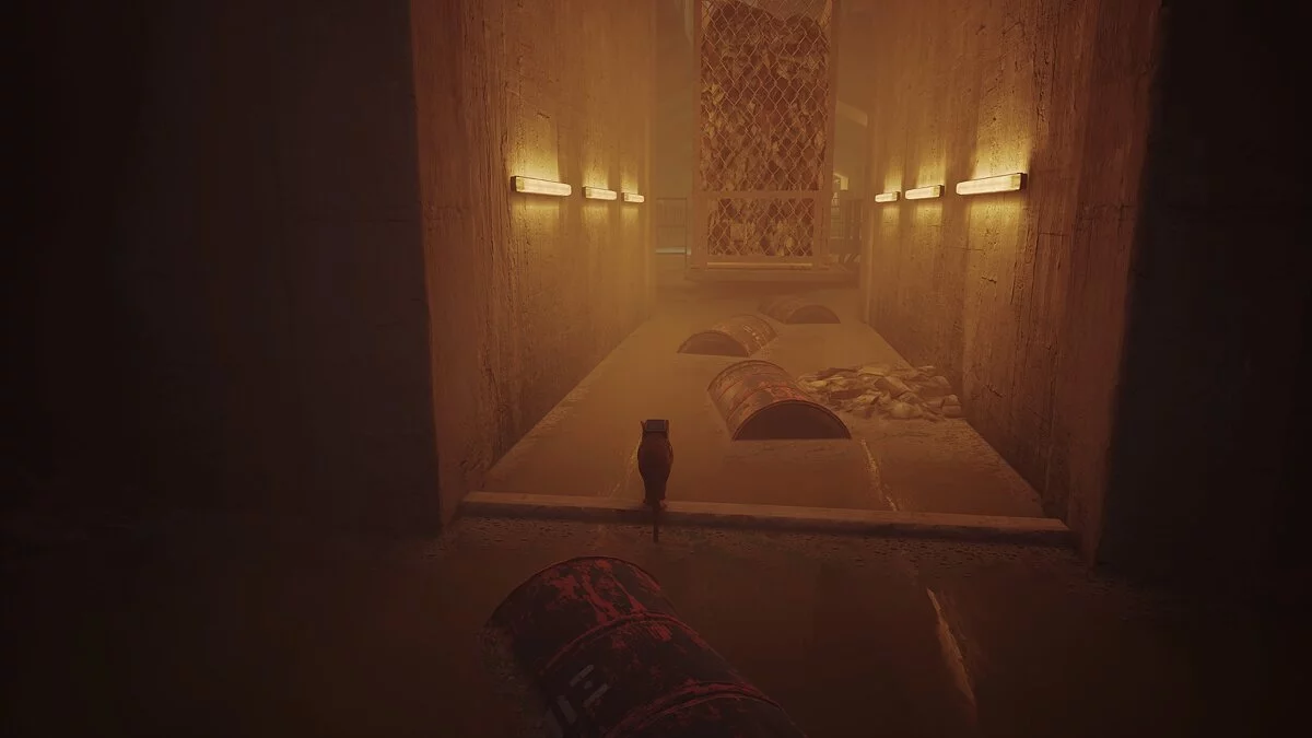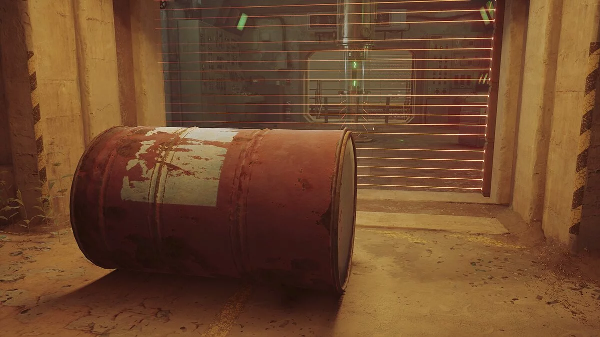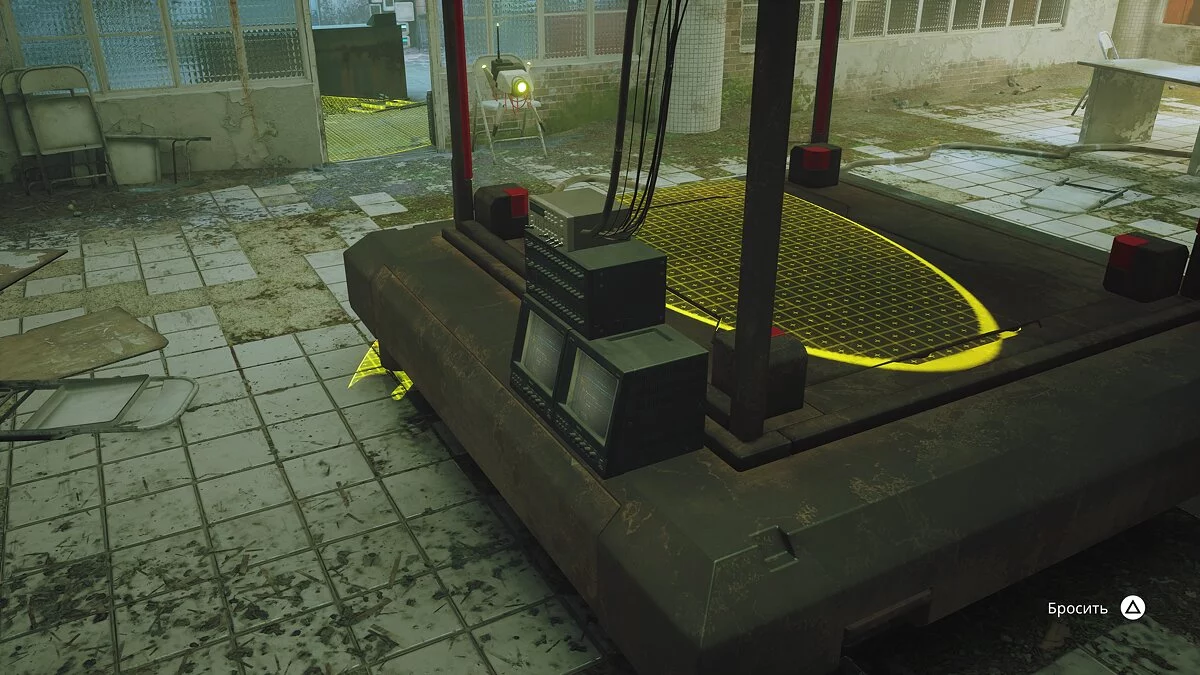 В этом помещении необходимо подождать, когда дрон слева полетит к правому устройству. Используем бочки и пробегаем до двери. Также по центру комнаты можно спрятаться в коробку и переждать действия дронов.