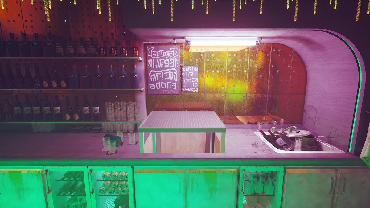 Запрыгиваем на стойку, забираем странный напиток и проходим к небольшому лифту на прилавке позади бармена.