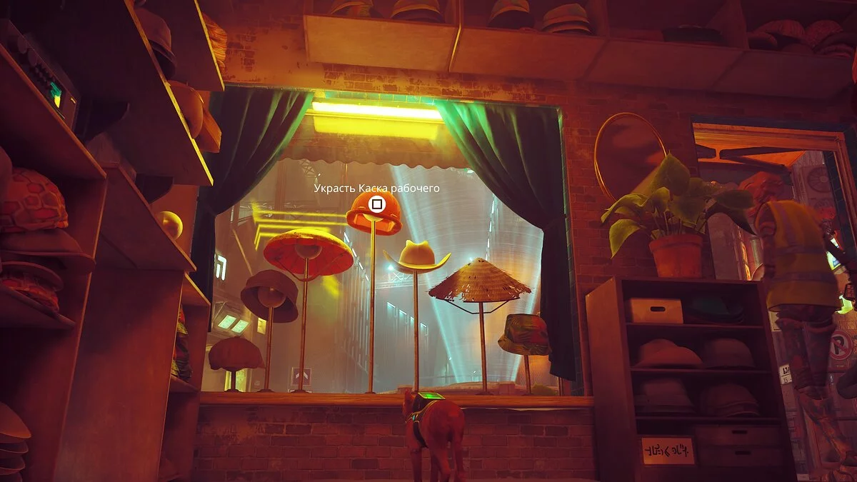 В дальней комнате находим спящего рабочего. Забираемся по лестнице на полку и сбрасываем ящик с бутылками на робота. Выбегаем из бара и идём к парикмахерской. Справа от неё расположен магазин со шляпами.