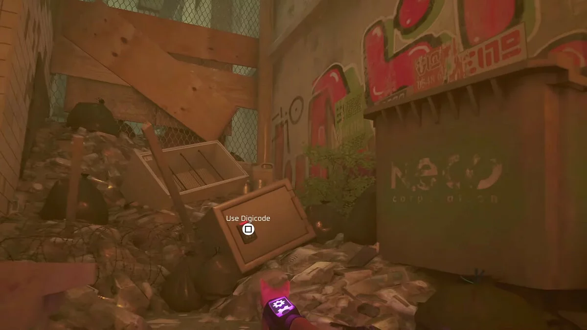 Местоположение сейфа легко отыскать сразу же после знакомства с Хранителем. Становимся лицом к роботу и тут же спускаемся по небольшой лестнице налево. Проходим мимо музыканта и сворачиваем в тупик с мусором. На горке с мешками расположен металлический сейф.