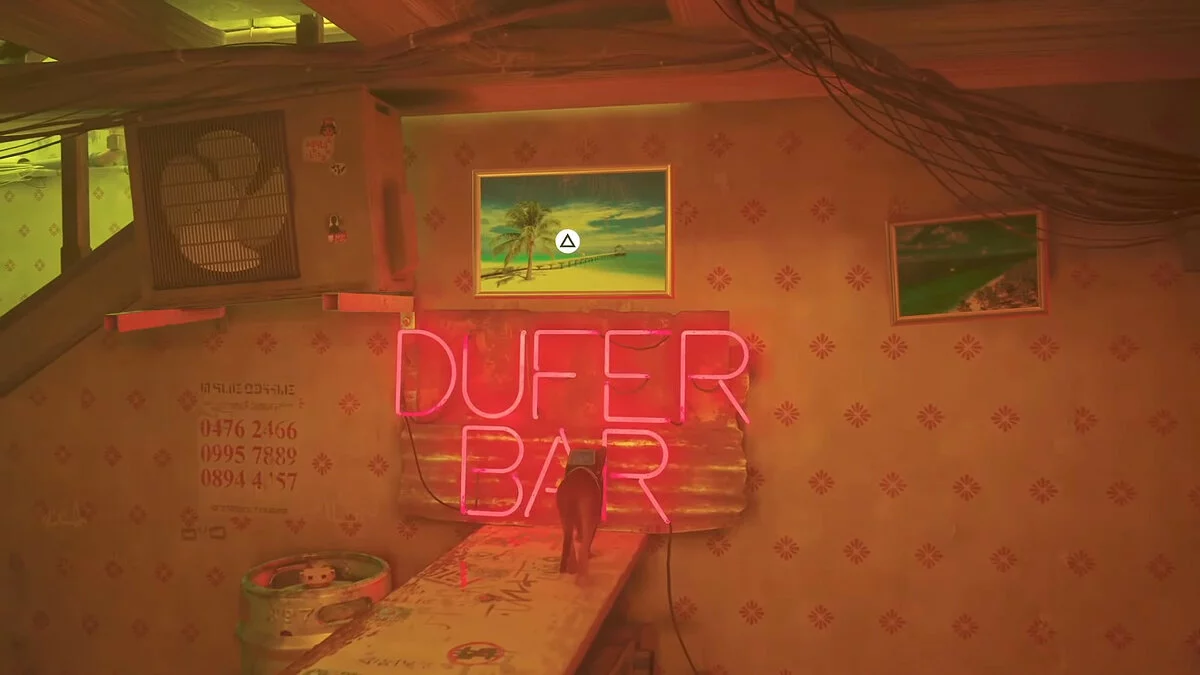 Возвращаемся к большой лестнице. На углу находится бар. Внутри помещения необходимо забраться на барную стойку и отыскать яркую надпись «DUFER BAR». Царапаем картину над этой неоновой вывеской и находим правильный код — «1283».
